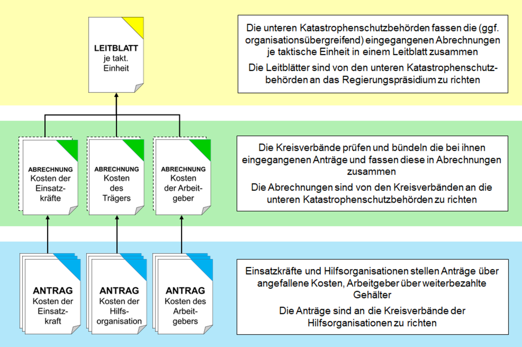 Die Kreisverbände der Hilfsorganisationen sammeln die Antragsformulare ihrer Einsatzkräfte, Untergruppierungen und deren Arbeitgeber fassen die beantragten Kosten in den zugehörigen Abrechnungsformularen zusammen, welche sie an die zuständige untere Katastrophenschutzbehörde übersenden. Die Inhalte der Antragsformulare sind durch die Hilfsorganisationen zu prüfen und die sachliche und rechnerische Richtigkeit festzustellen.