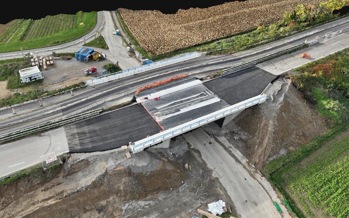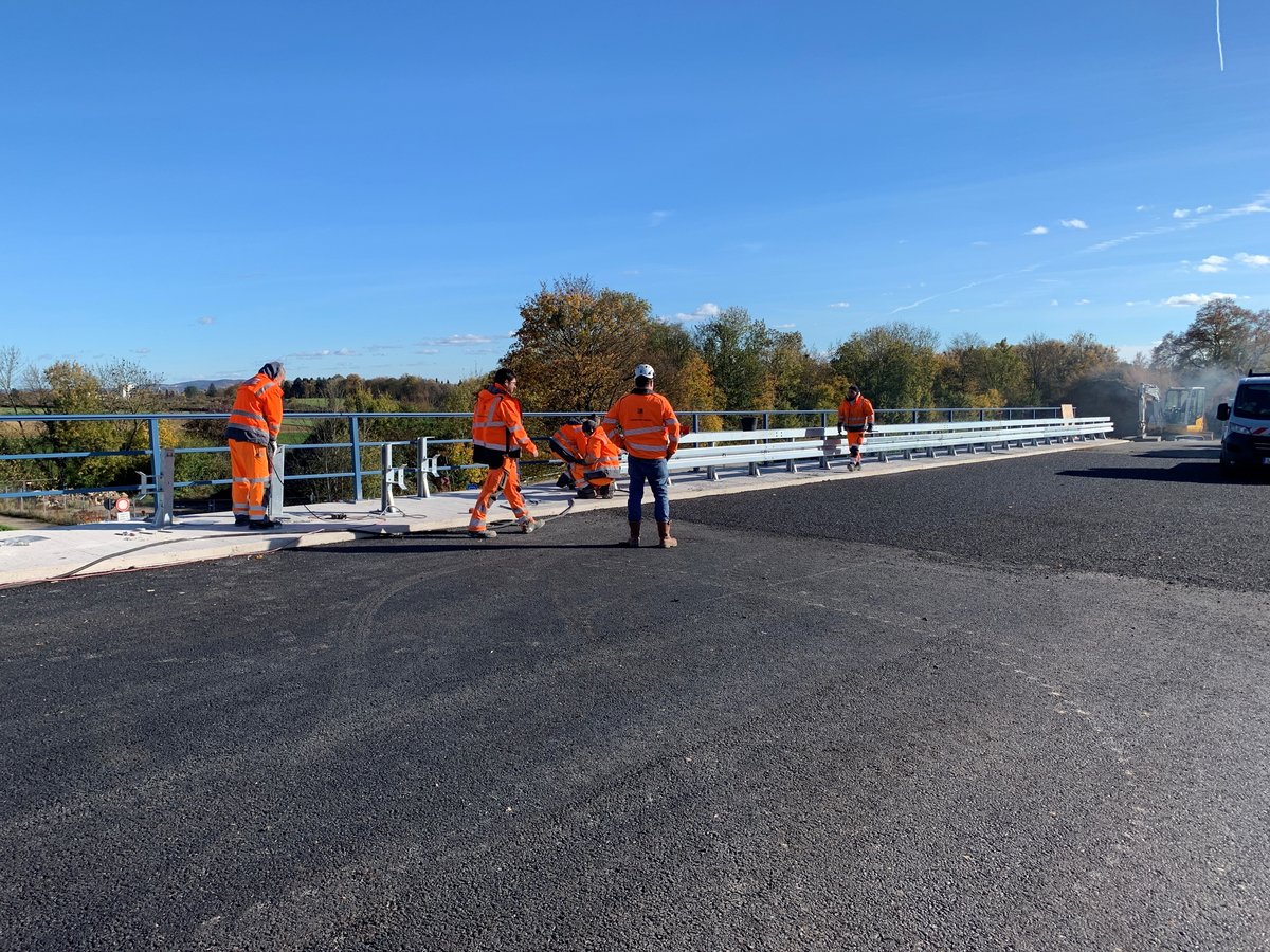 Der neue östliche Überbau ist größtenteils fertiggestellt. Auch die Asphaltarbeiten stehen hier kurz vor dem Abschluss. Als nächstes folgen die Arbeiten an den Schutzeinrichtungen auf der Brücke und der anschließenden Straße. Diese werden größtenteils als Betonleitwände hergestellt.