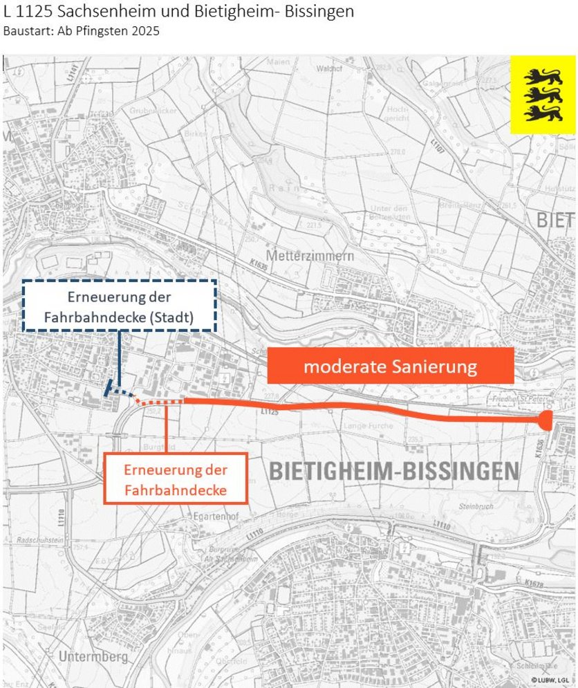 Im Zuge der Bauausführung werden verschiedene Knotenpunkte entlang der L 1125 angepasst. Gleichzeitig werden die Entwässerungseinrichtungen umfassend erneuert und die Radwegverbindung Metterzimmern- Bietigheim durch das Errichten einer Querungshilfe für den Radverkehr verbessert. Außerdem wird im gesamten Bereich die Fahrbahn der L 1125, inklusiver der Fahrbahnränder, grundlegend saniert und die Fahrbahnmitteltrennung im Bereich der JET-Tankstelle verlängert. Die moderate Sanierung endet kurz hinter der Kreuzung L 1125 Industriestraße. Die Arbeiten sollen im Oktober 2025 abgeschlossen sein.