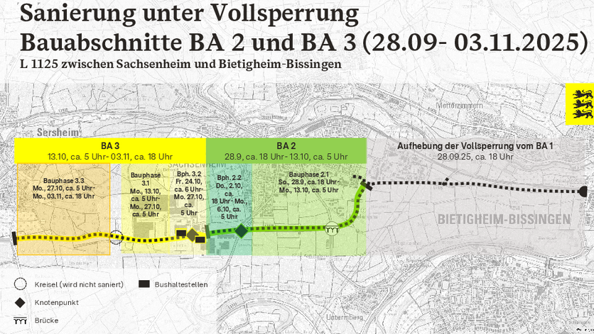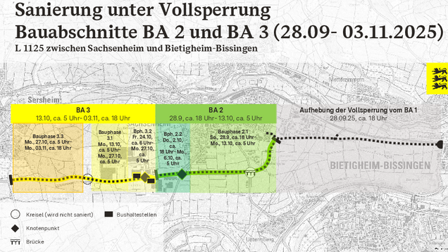 Die Sperrung erfolgt direkt nach der Öffnung der L 1125 Richtung Bietigheim-Bissingen am Sonntag, 28. September und dauert voraussichtlich bis Montag, 13. Oktober 2025.