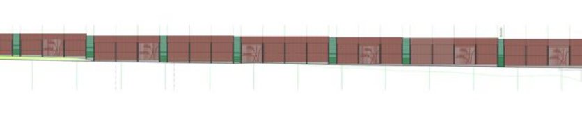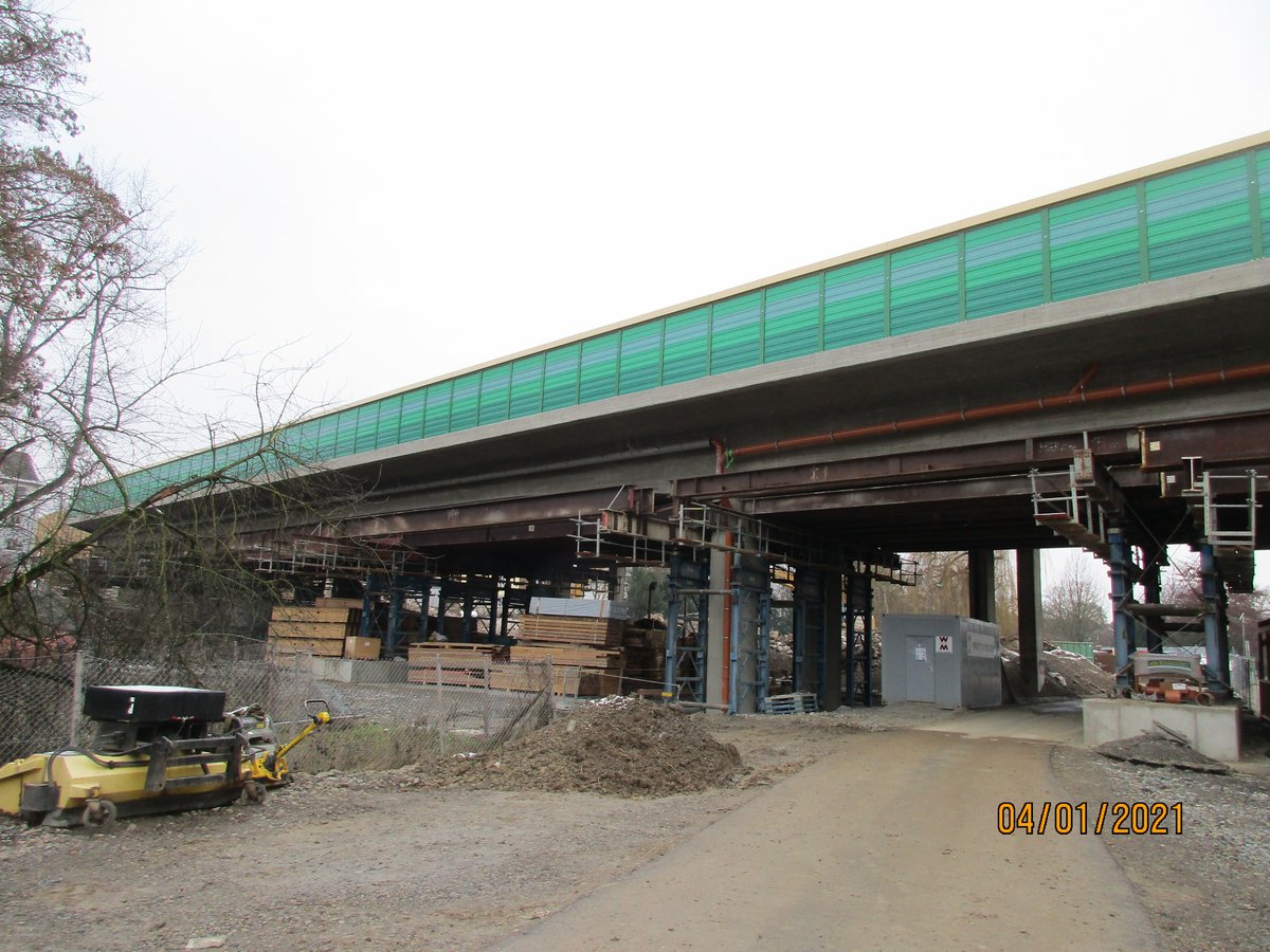 - Außerhalb des eigentlichen Brückenbereichs lehnen sich die vorgesehenen Lärmschutzeinrichtungen gestalterisch an den Bestand an. Die je nach Position 4 bis 6 Meter hohen und 5 Meter breiten Stahlbetonfertigteile verfügen über eine rötlich eingefärbte Porenbetonstruktur und werden dem Geländeverlauf entsprechend höhengestaffelt aufgestellt. Die Zwischenelemente bestehen aus farbig beschichteten Alukassette.