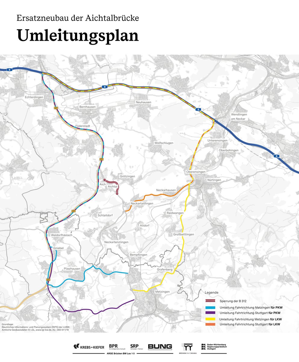 Südlich des Stuttgarter Flughafens zweigt die B 312 von der B 27 ab und verläuft weiter Richtung Reutlingen. Im Abschnitt zwischen Aichtal und Neckartailfingen kreuzen die B312 inmitten von FFH-Mähwiesen und angrenzendem Biotop die Aich und die L 1185 (Grötzinger Straße). Beim hierfür erforderlichen Überführungsbauwerk handelt es sich um die Aichtalbrücke B 312. Das Brückenbauwerk wurde 1960 als einteiliger Spannbetonhohlkasten mit einer Gesamtlänge von 253m errichtet. 2011 bis 2013 wurden Ertüchtigungsmaßnahmen durchgeführt, wobei die Fahrbahnbreite deutlich eingeengt werden musste. Aufgrund vorherrschender statischer und konstruktiver Defizite mit einer Zustandsnote von 3,0 und einem Traglastindex V ist eine Sanierung/Ertüchtigung des Bestands nicht mehr umsetzbar. Entsprechend wird ein Ersatz des bestehenden Brückenbauwerks durch einen Neubau an gleicher Stelle vorgesehen.