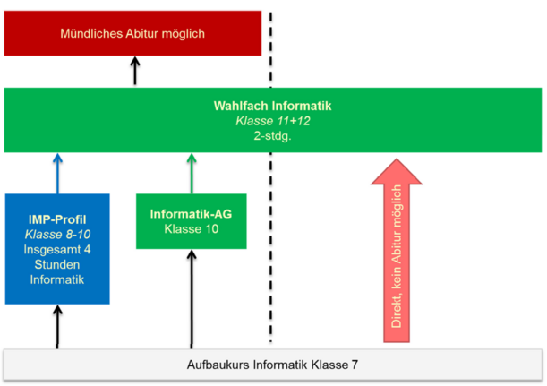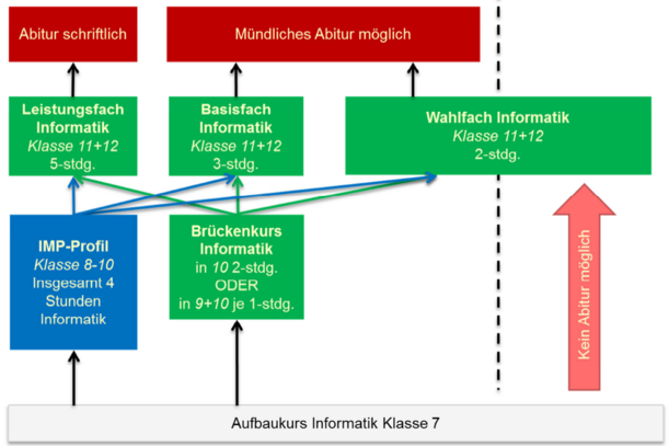 Dies ermöglicht den Schülerinnen und Schülern im Anschluss an den „Brückenkurs Informatik“ in Klasse 10 (G8), im Anschluss an das bisherige Profilfach IMP nach Klasse 10 (G8) oder zukünftig nach Abschluss von Klasse 11 im neuen G9 entweder die Teilnahme am dreistündigen Basisfach Informatik oder am fünfstündigen Leistungsfach Informatik (Modul Leistungsfach).