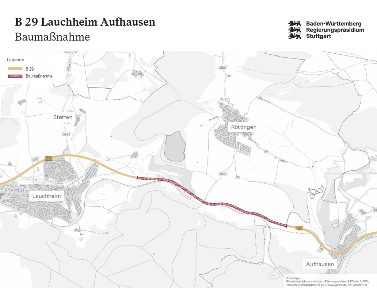 Ausbau der B 29 zwischen Lauchheim und Bopfingen-Aufhausen zu einer dreistreifigen Straße. Hierbei erhält jeweils die „bergauf“ Fahrtrichtung Röttinger Höhe einen zusätzlichen Fahrstreifen, sodass der Schwerverkehr bergauf sicher überholt werden kann.