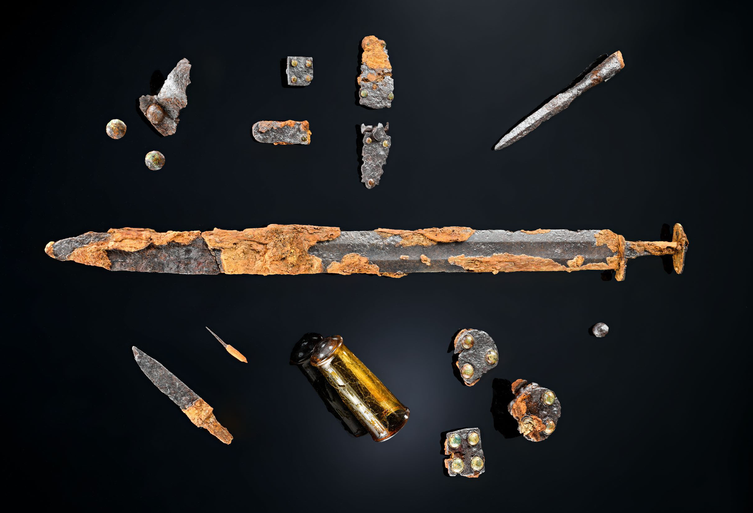 „Die meisten Bestattungen enthalten Beigaben wie Waffen, zum Beispiel Schwerter, Lanzen, Schilder, und Schmuck wie Glasperlen, Ohrringe, Gürtel oder Gürtelgehänge“, sagte Dr. Andreas Haasis-Berner, zuständiger Gebietsreferent beim LAD, heute (18. August 2022) vor Ort bei der Vorstellung der aktuellen Ergebnisse in Gutmadingen gemeinsam mit der Grabungsfirma und der Stadt. Kämme aus Knochen oder ein Trinkglas seien als Besonderheiten zu nennen. Anhand dieser Beigaben könne das Gräberfeld in das 6. Jahrhundert datiert werden.