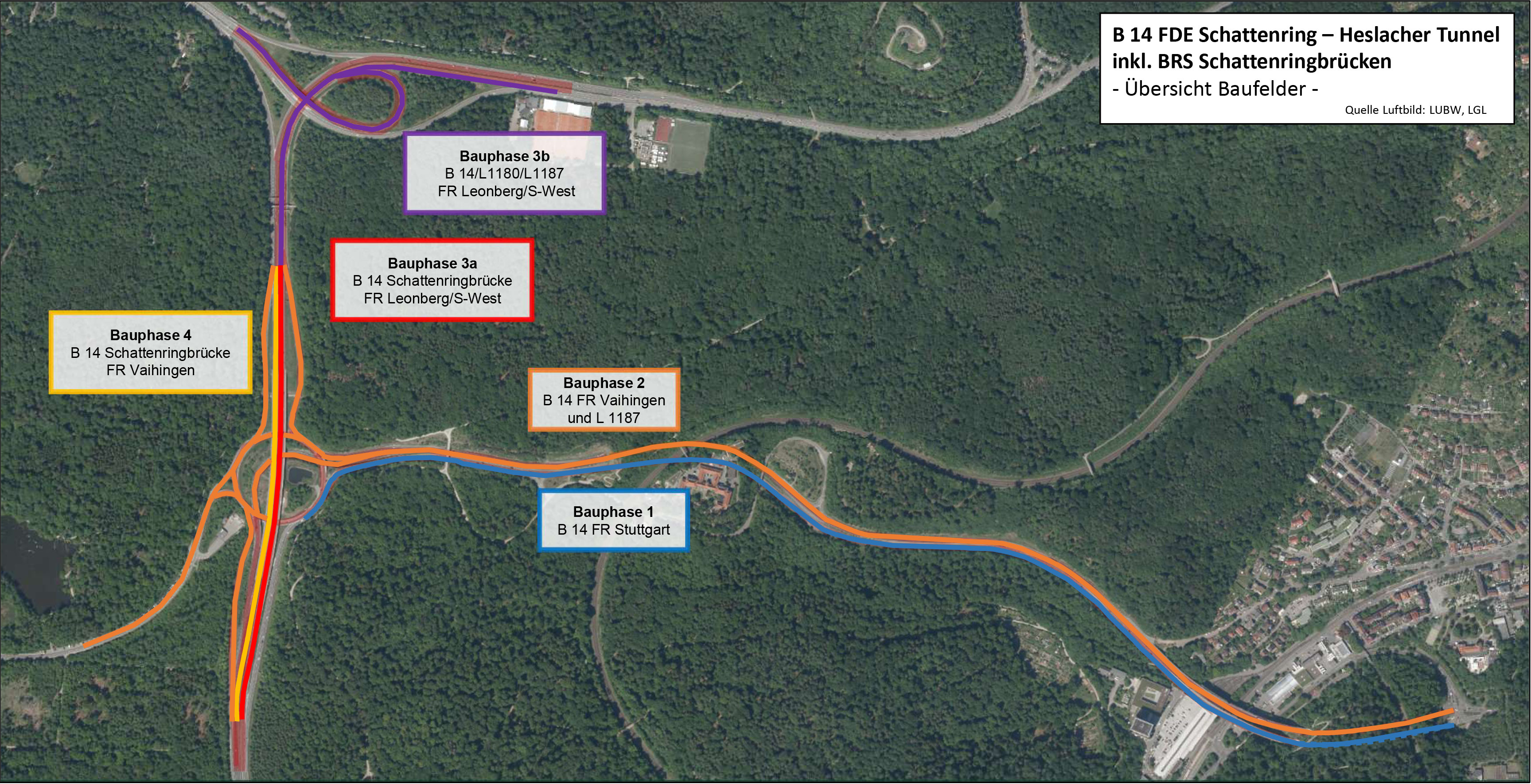 Die Sanierungsmaßnahme auf der B 14 zwischen Schattenring und Heslacher Tunnel war in mehrere Bauphasen/ -abschnitte unterteilt, vergleiche Übersicht Baufelder. Zunächst wurden in den ersten beiden Bauphasen die Fahrbahn auf dem Streckenabschnitt der B 14 zwischen dem Schattenring und dem Heslacher Tunnel – stadtaus- und stadteinwärts – umfassend erneuert. Die Arbeiten an der Fahrbahn umfassten dabei auch den Kreisverkehr Schattenring sowie die angrenzenden Rampenbereiche. In einer nächsten Bauphase wurde anschließend die Schattenringbrücke in Fahrtrichtung Vaihingen saniert.