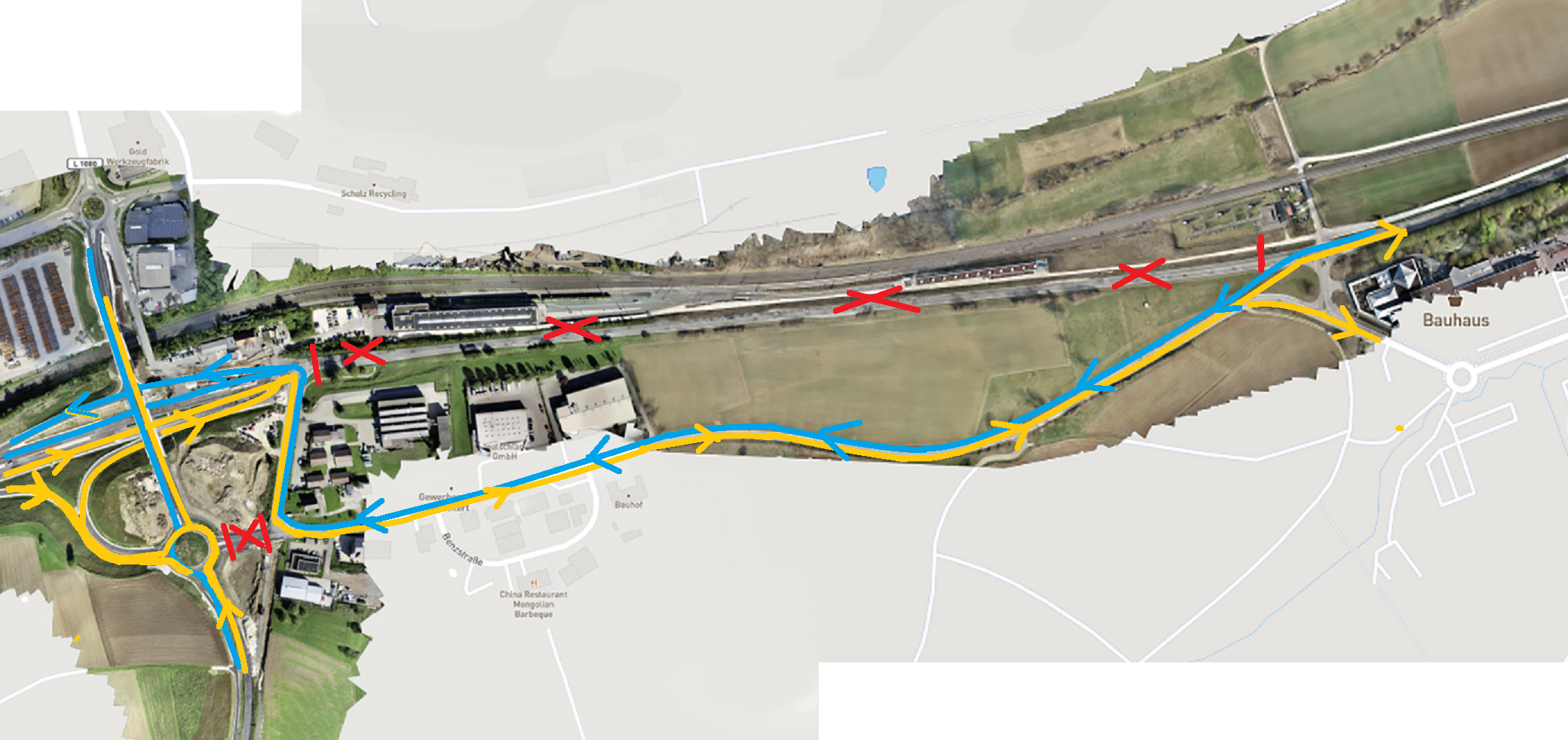 Während der Umbauarbeiten ist kein Abbiegen von der bestehenden B 29 in Richtung Bauhaus sowie kein Einbiegen vom Bauhaus in die B 29 möglich – weder aus Fahrtrichtung Schwäbisch Gmünd noch aus Fahrtrichtung Aalen kommend. Nach Fertigstellung des Provisoriums verläuft die Umleitungsstrecke von Aalen kommend über die Ausleitung am Knoten Bauhaus / Zufahrt Talhof, die Humboldt-, Daimler-, Bahnhofstraße in Richtung B 29 Fahrtrichtung Schwäbisch Gmünd und entgegengesetzt. Verkehrsteilnehmende, die nach Essingen und nach Forst fahren wollen, werden auf die am Dienstag, 30. Mai 2023, in Betrieb gehende Rampe bei der Esso-Tankstelle geleitet. Im Zuge der Inbetriebnahme dieser Rampe wird die Zufahrt von Daimler zum Kreisverkehr „Stockert“ bis Sonntag, 11. Juni 2023, in beide Fahrtrichtungen gesperrt. Die Anbindung der Firma Magnaflux in Richtung Essingen kann über die Rampe bei der Esso-Tankstelle und im weiteren Verlauf über den Kreisverkehrsplatz „Stockert“ und die Bahnhofstraße erfolgen.