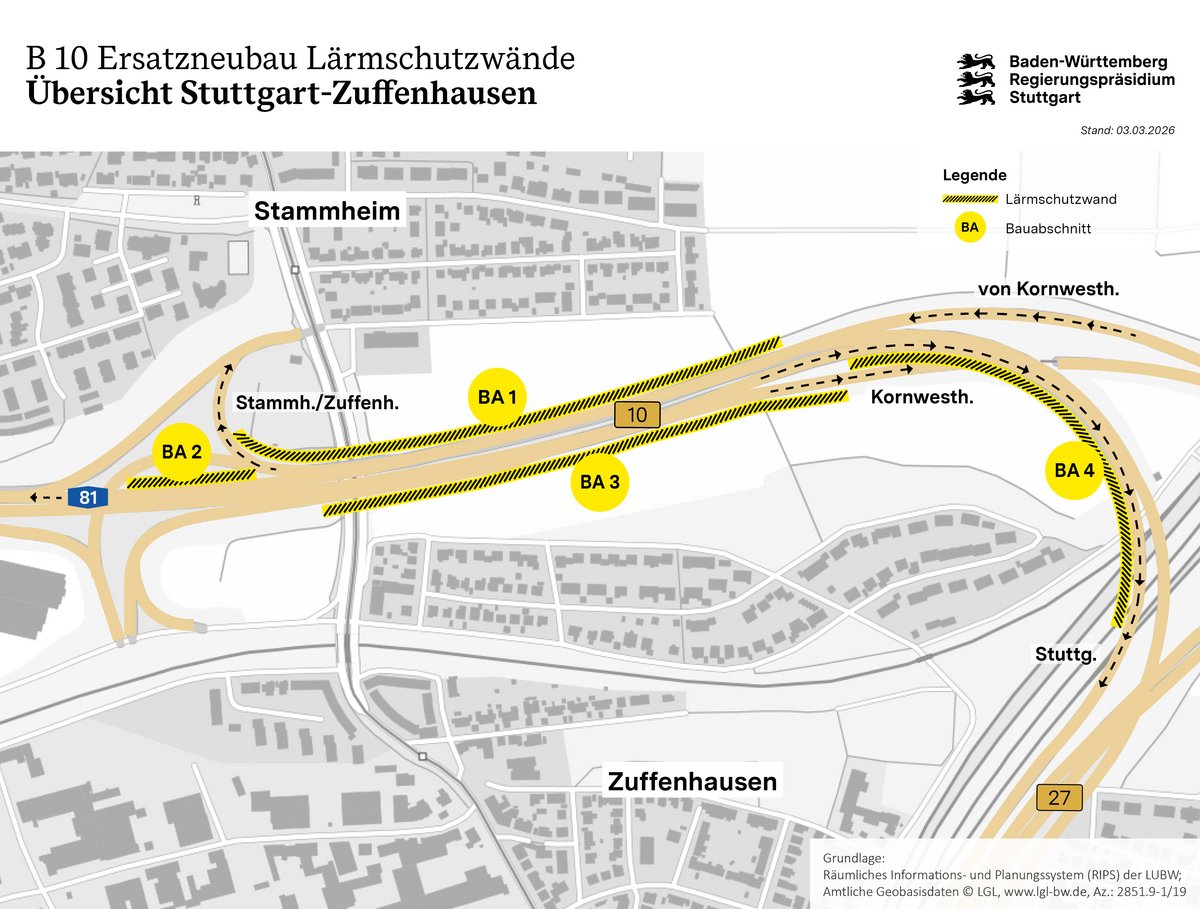 Die bestehenden Lärmschutzwände befinden sich zwischen den Stuttgarter Stadtteilen Stammheim und Zuffenhausen im Bereich des B 10/B 27-Dreiecks Zuffenhausen. Die Lärmschutzwände sind in schlechtem Zustand und müssen daher erneuert werden.