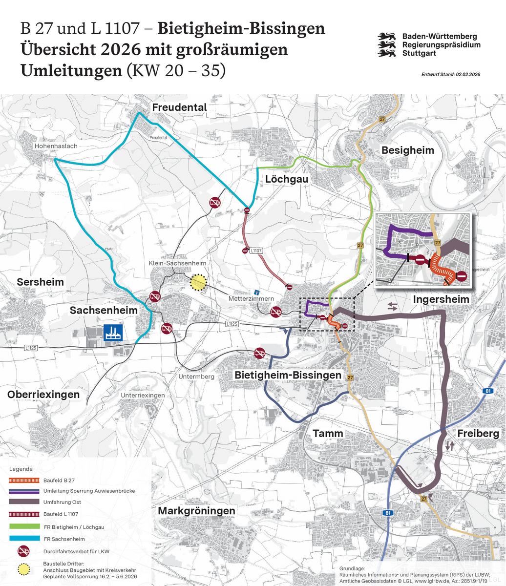 Die Maßnahme wird parallel zur Sanierung der B 27 Ortsdurchfahrt Bietigheim-Bissingen durchgeführt. Informieren Sie sich hier.