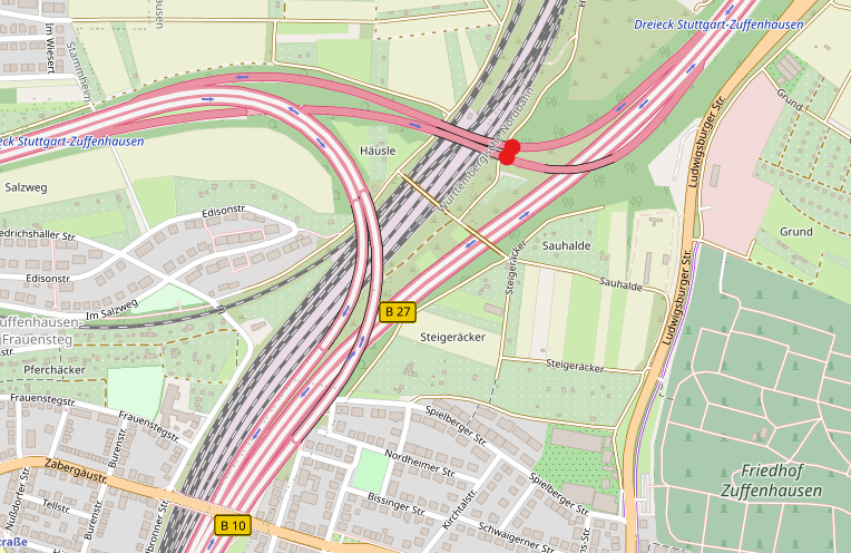 Vom 30. Januar bis 1. Februar 2025 werden am Dreieck Stuttgart-Zuffenhausen auf der B 10 temporäre Stahlplatten an den Brücken über die Bahngleise eingebaut, um die beschädigten Fahrbahnübergänge zu überbrücken. Die Erneuerung der Übergänge ist für den Sommer 2025 geplant. Während der Arbeiten kommt es zu nächtlichen Sperrungen.