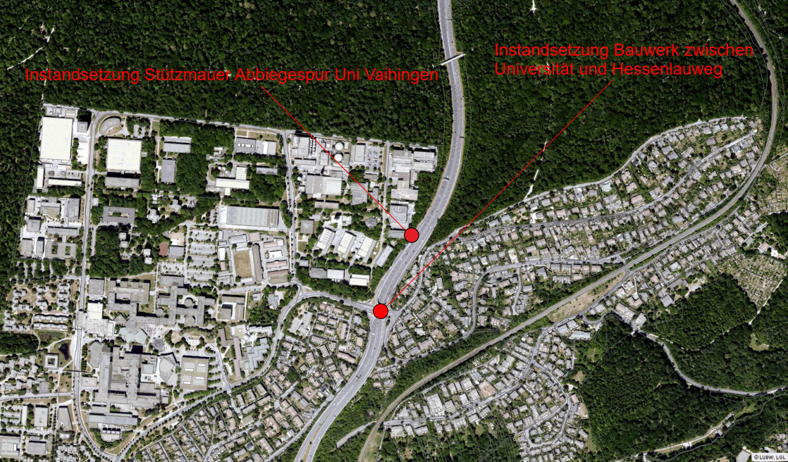 Das Regierungspräsidium Stuttgart (RPS) wird ab der kommenden Woche mehrere Bauwerke im Bereich des Schattenrings in Stuttgart-Vaihingen/-Süd instandsetzen und erneuern (s. Lageplan).