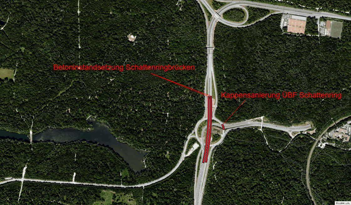 Parallel zu den beiden oben genannten Arbeiten finden Betoninstandsetzungsarbeiten an den beiden großen Brücken über den Schattenring im Zuge der B 14 statt. Nachdem im letzten Jahr der Belag und die Abdichtung dieser Bauwerke erneuert wurden, folgt nun die Betoninstandsetzung der Unterbauten, also an den Widerlagern und Stützen sowie an den Außenbrüstungen. Hierfür muss jedoch nicht in den Verkehr eingegriffen werden. Für die Arbeiten wird die bauausführende Firma voraussichtlich zwei Wochen benötigen.