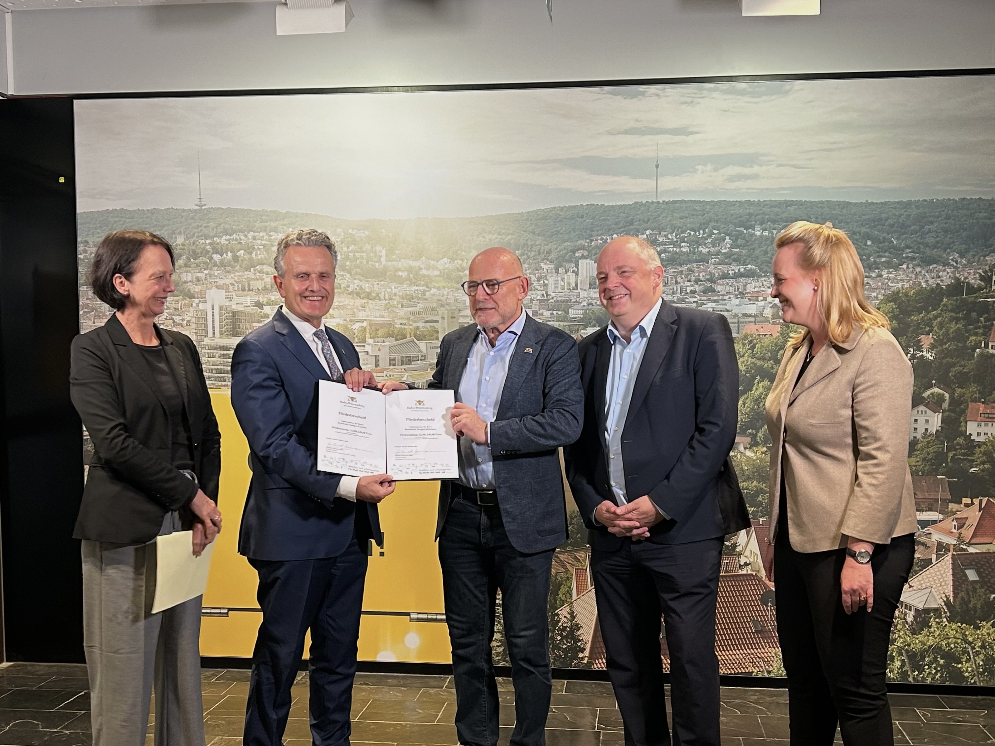 Heute (8. Oktober 2024) fand die offizielle Übergabe der beiden Förderbescheiden an die SSB AG mit Verkehrsminister Winfried Hermann, Regierungspräsidentin Susanne Bay, Stuttgarts Oberbürgermeister Dr. Frank Nopper sowie dem Vorstandssprecher der SSB AG Thomas Moser in Stuttgart-Möhringen statt.