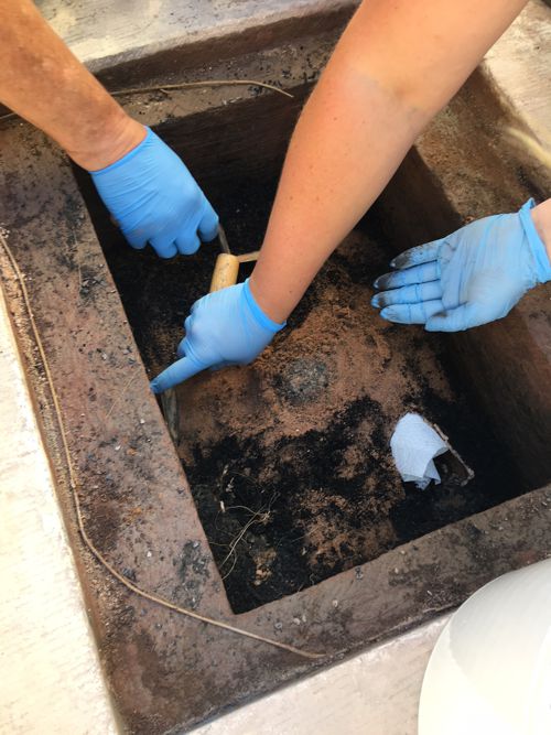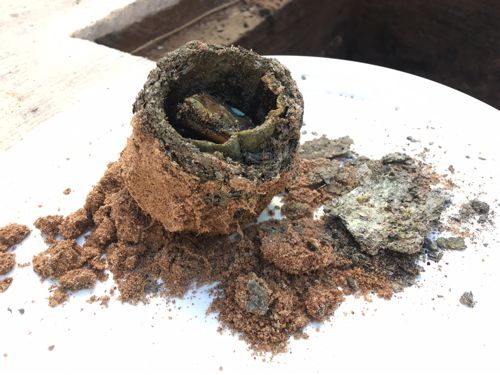 Gestern, am 2. Juli 2018, wurde im Beisein der Presse und der Öffentlichkeit von einer Fachfirma die Inschriftenplatte vom Grundstein abgehoben, um das Stück zu sichern und für die später beabsichtigte Aufstellung in Pforzheim zu restaurieren. Im darunter liegenden Hohlraum wurde zunächst ein in eine Holzkohleschicht gebettetes Glas mit Weizenähren gefunden, möglicherweise ein Symbol für die Erntezeit im August oder aber vielleicht ein Nachhall auf die Zeiten großer Not und Missernten nach dem Ausbruch des indonesischen Vulkans Tambora 1817. Darunter lagen in einer Sandschicht zwei weitere, jedoch nicht so gut erhaltene Gläser sowie eine Zeitkapsel aus Zinn oder Blei. Soweit erkennbar enthält diese einige Münzen. Zuunterst konnte aus dem Grundstein schließlich eine leider völlig korrodierte Inschriftenplatte aus Weißmetall geborgen werden.