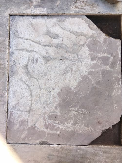 Inschriftenplatte des Grundsteins mit schemenhaftem Abdruck der Grundsteinlegung: 25. August 1829, Quelle: LAD