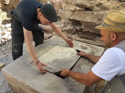 Anhebung der Inschriftenplatte des Grundsteins durch Maxim Kromm und Michael Schrem (von links), Quelle: LAD
