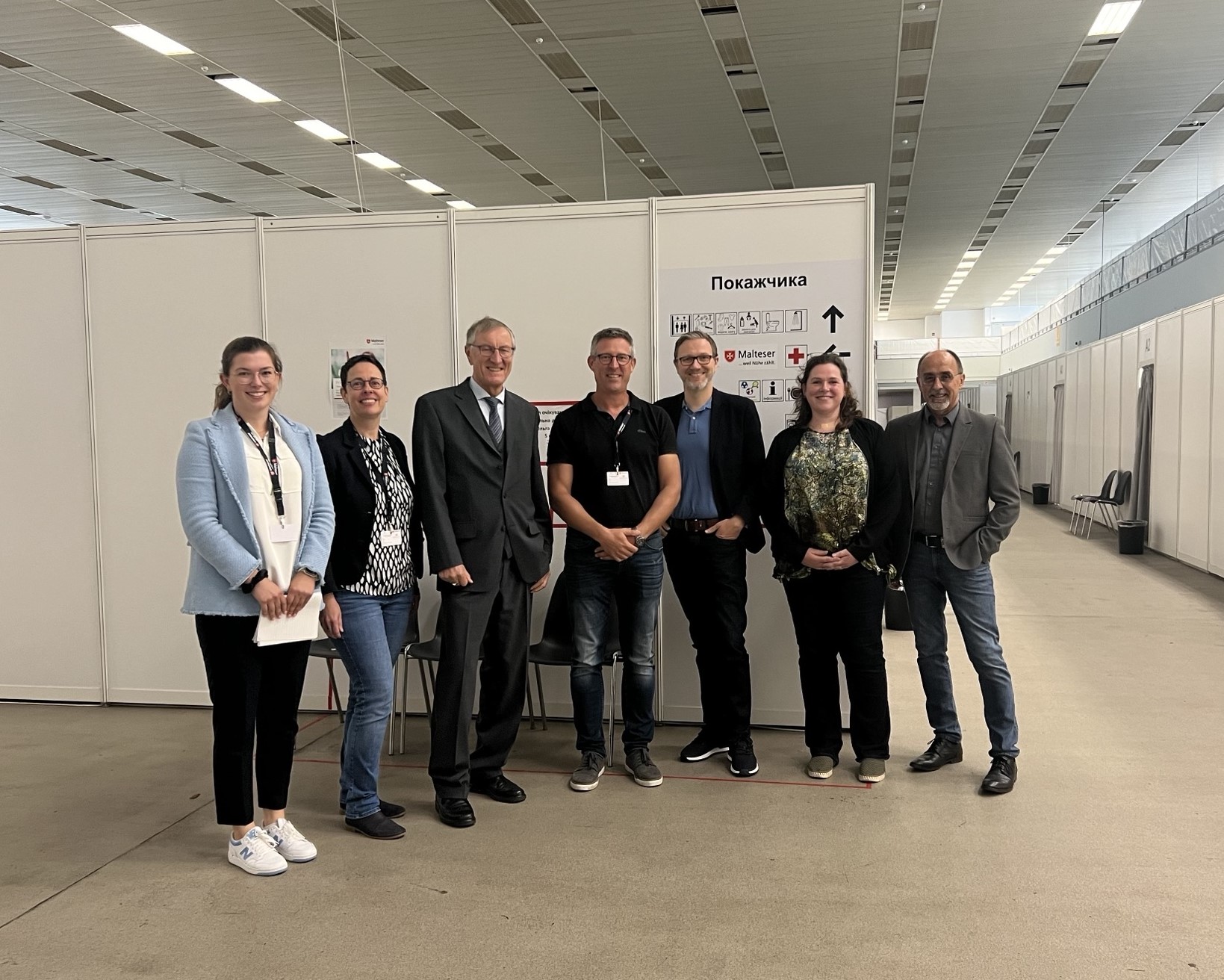 Auf dem Foto sind zu sehen: Landrat Roland Bernhard (3. von links), Thomas Deines (Referatsleiter 15.2 im Regierungspräsidium Stuttgart (RPS); Mitte), Dusan Minic (Dezernent für Jugend und Soziales; 3. von rechts), Katharina Pfister (Leiterin Amt für Migration und Flüchtlinge; 2. von rechts), Jochen Hirneise (stv. Leiter Amt für Migration und Flüchtlinge; ganz rechts), Henriette Alffen (Leiterin der Aufnahmestelle für ukrainische Geflüchtete in Sindelfingen; ganz links), Jutta Pfänder (Sachgebietsleitung Unterbringung und Haushalt im Ref. 15.2, RPS; 2. von links). Quelle: Landratsamt Böblingen