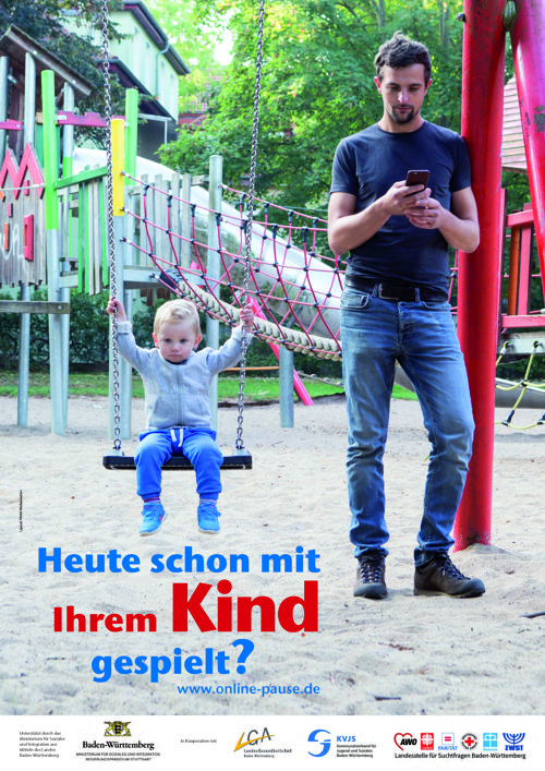 Das Ministerium für Soziales und Integration Baden-Württemberg und das Landesgesundheitsamt Baden-Württemberg im Regierungspräsidium Stuttgart haben in Kooperation mit der Landesstelle für Suchtfragen und dem Kommunalverband für Jugend und Soziales am Freitag (3. Mai) eine Plakataktion gestartet, die Eltern anregen soll, über ihr eigenes Verhalten mit dem Handy beziehungsweise Smartphone in Gegenwart ihrer Kinder nachzudenken.