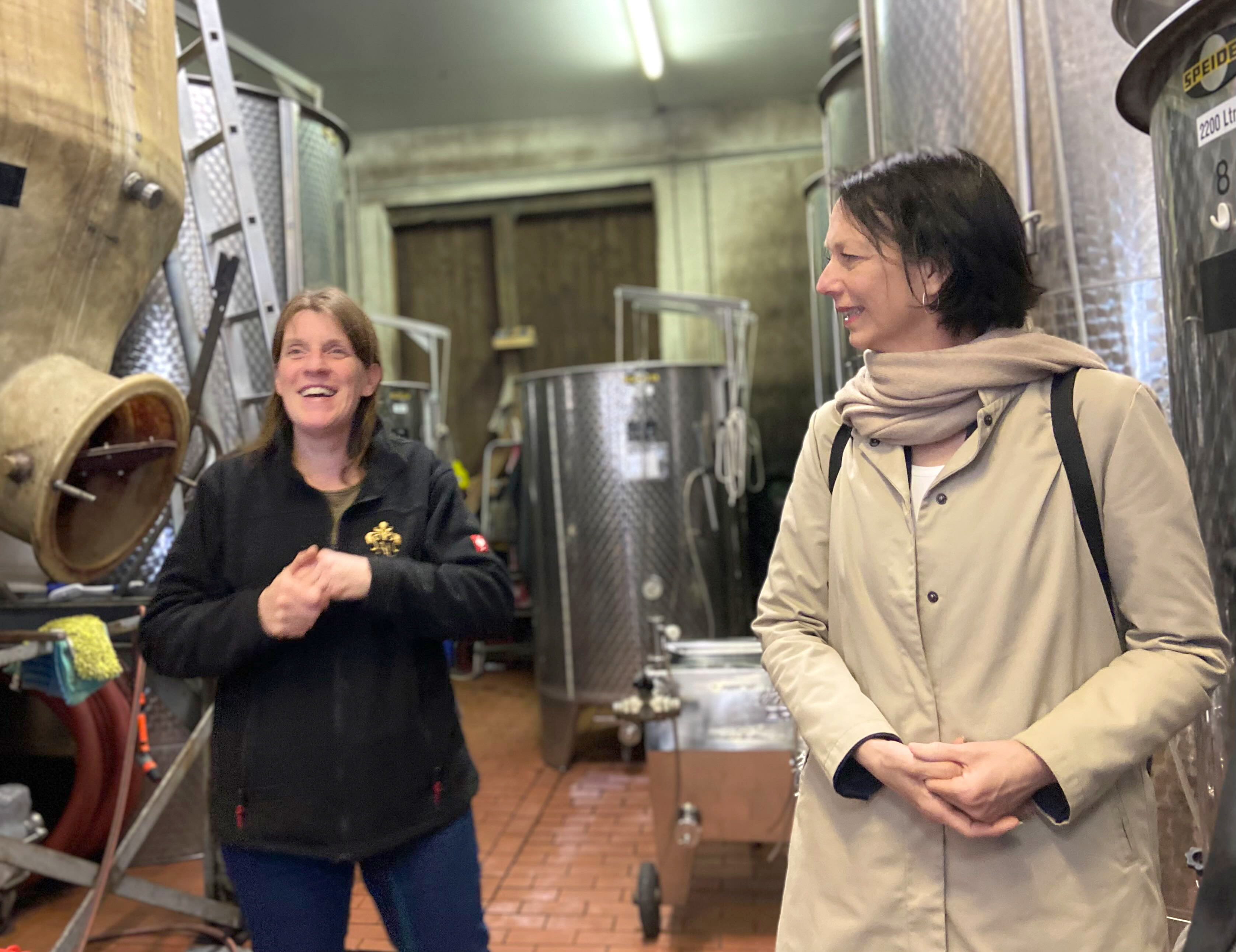 Bild 3 (jpg, 2.7 MB): Anita Landesvatter (links) mit Susanne Bay (rechts) bei der Führung durch das Weingut.