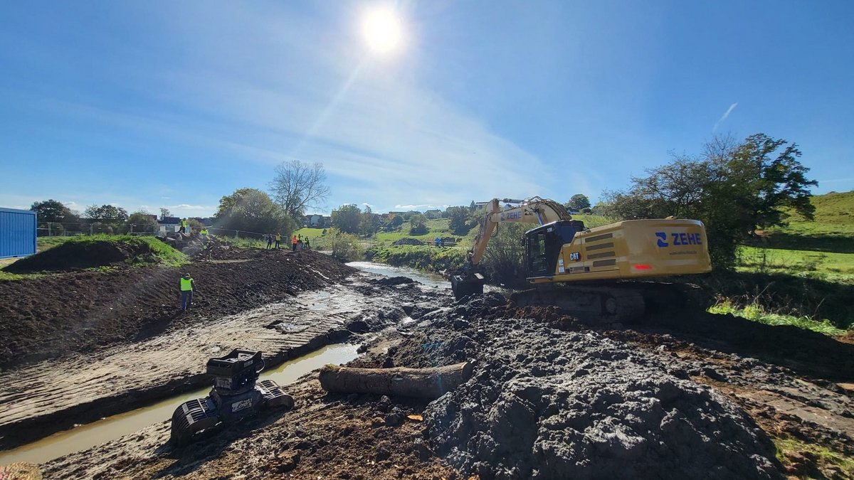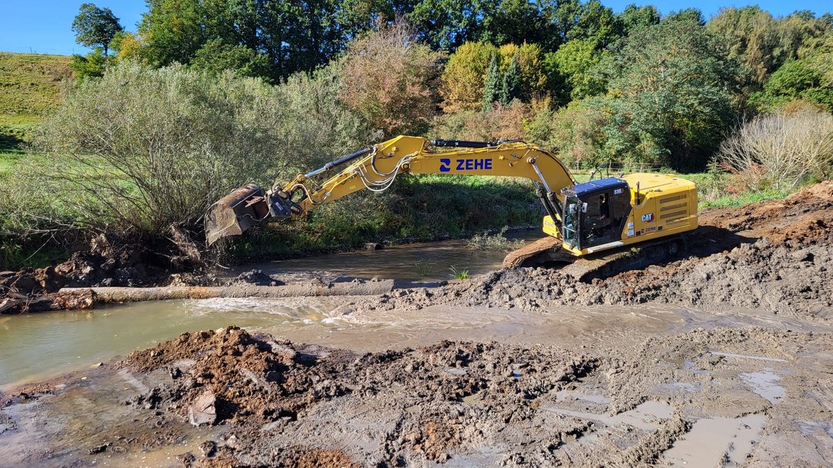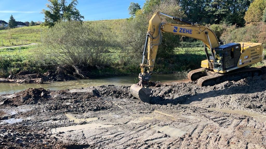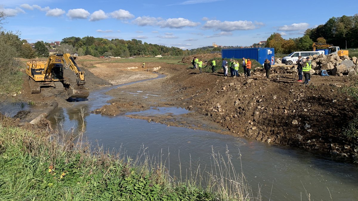 Fast unscheinbar, aber mit großer Bedeutung, waren die wenigen letzten Baggerbisse - im Verhältnis zur großen Erdbewegung der Geländegestaltung - die nötig waren, um das Wasser umzuleiten: Jetzt fließt die Jagst bereits in weiten Teilen in ihren neuen Schlaufen. Beim Vor-Ort-Termin am Montag nahe des Sportgeländes Schrezheim waren Flussmeister Melchior Rettenmeier, Regierungspräsidium Stuttgart, sowie Oberbürgermeister Michael Dambacher, Josef Gentner, Geschäftsführer Wasserverband Obere Jagst, und das Ellwanger LGS-Team Zeuge, wie die ausführende Firma Zehe Gewässerbau mit dem Bagger erst einen Stamm als Leitplanke und dann das Erdreich in den alten Kanal der Jagst legte. Langsam bahnt sich die Jagst nun ihren neuen, rund 600 Meter längeren Weg auf die Stadt zu.