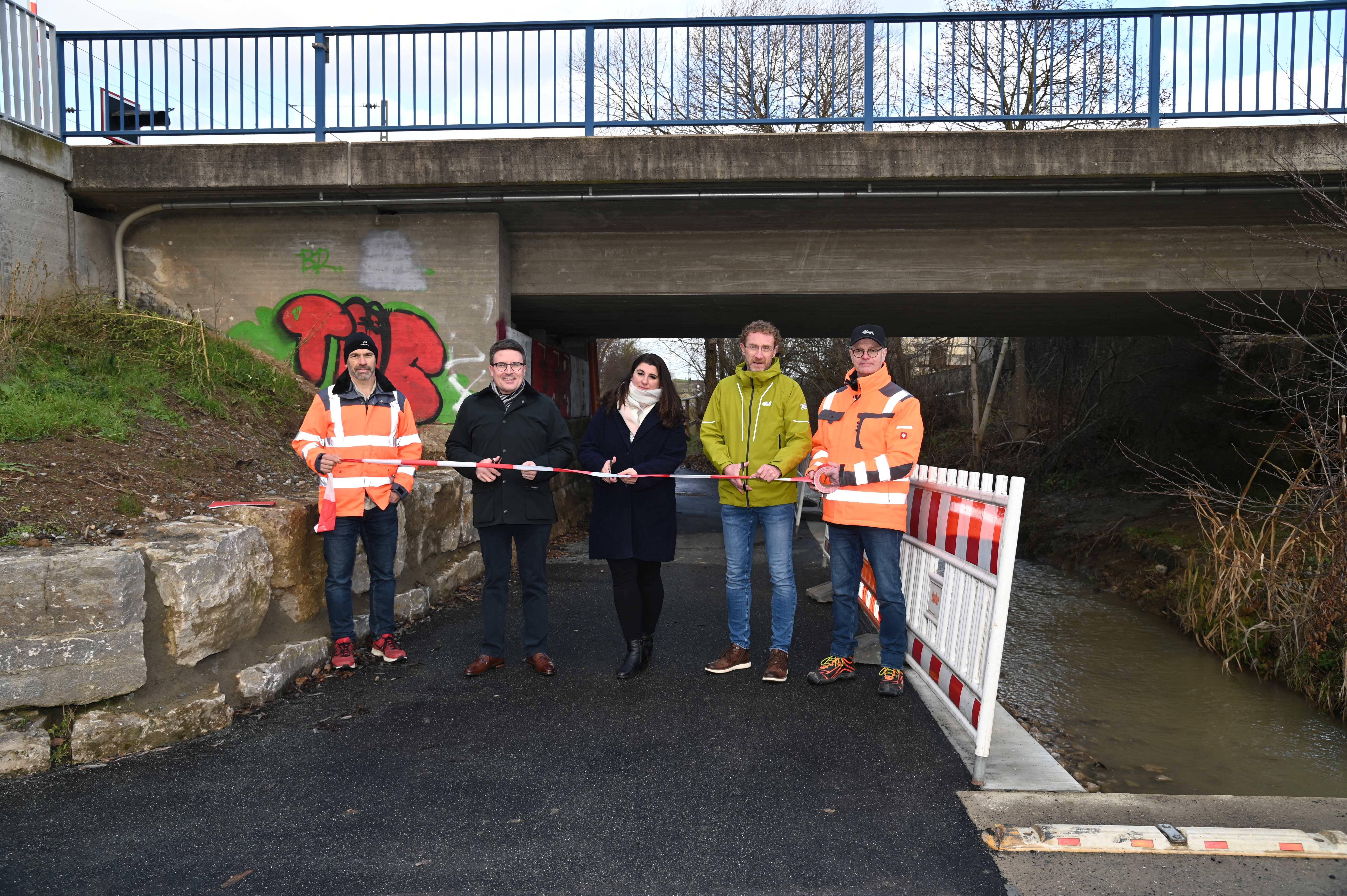 Bild: Statt die K 2809 überqueren zu müssen, können Radfahrer jetzt eine sichere Unterführung nutzen (von links): Sebastian Bokmeier (Straßenbauamt), Landrat Christoph Schauder, Christiane Feil (Regierungspräsidium), Bürgermeister Marcus Wessels und Straßenbauamtsleiter Markus Metz eröffnen den neuen Radweg-Abschnitt bei Oberwittighausen. Foto: Landratsamt Main-Tauber-Kreis, Aylin Wahl