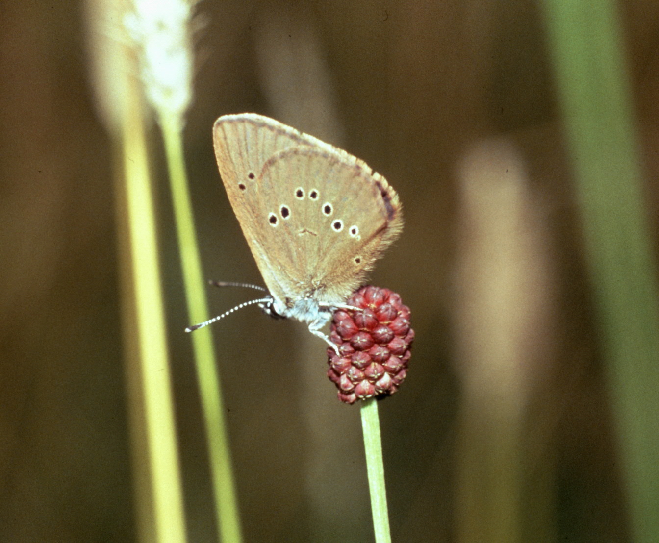 Bild 3: Der seltene und gefährdete Dunkle Wiesenknopf-Ameisenbläuling auf einer Blüte des Großen Wiesenknopfs. (jpg, 344 KB), Foto: RP Stuttgart