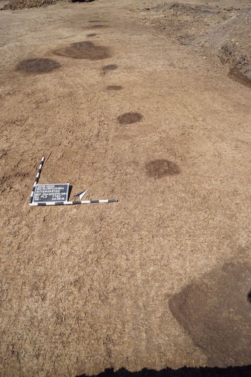 Im hellen Boden zeichnen sich Pfostengruben eines Holzgebäudes und Gruben ab