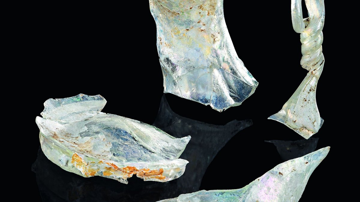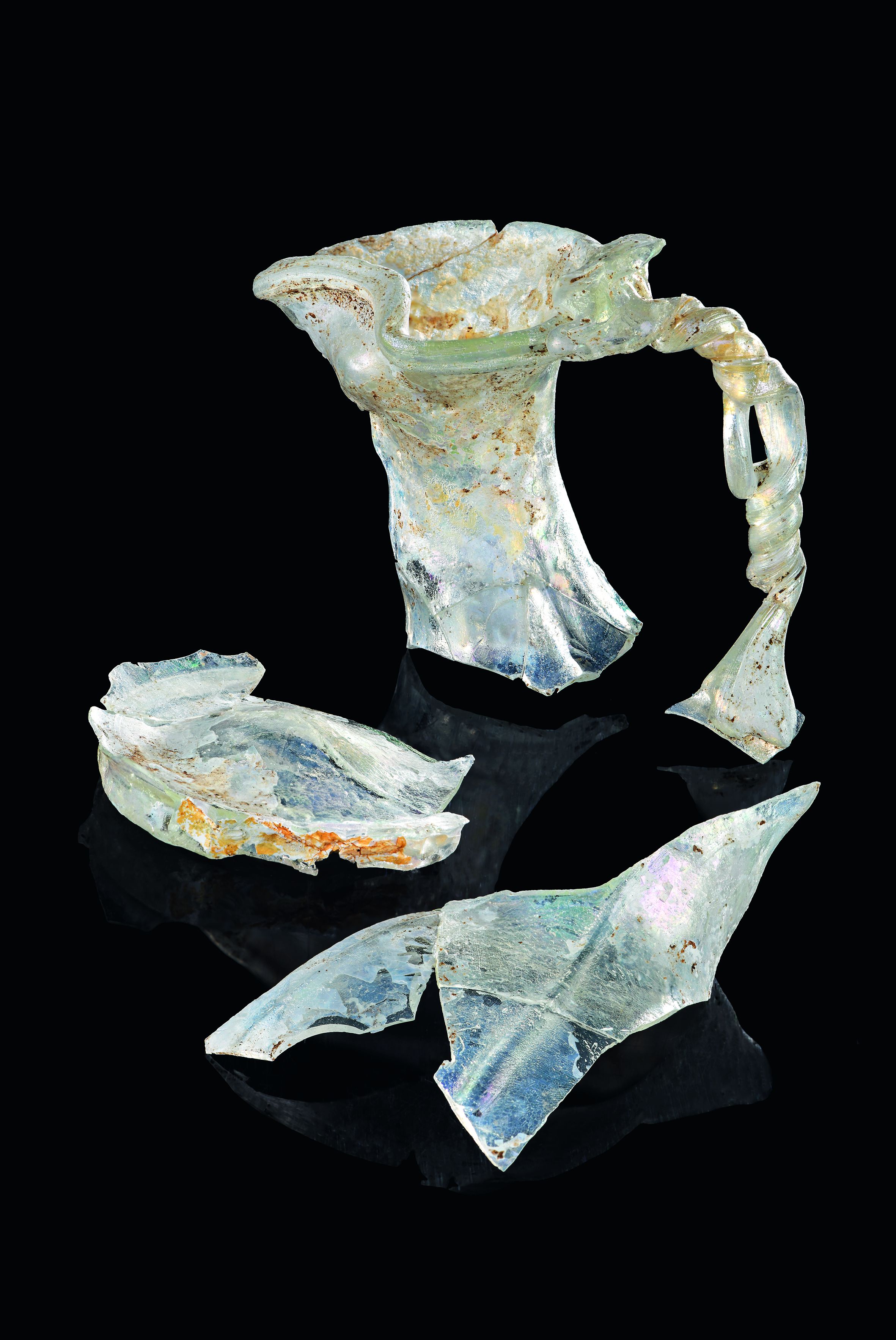 Abb. 5: Aus dem römischen Neuenstadt am Kocher stammt ein aufwändig gearbeiteter, luxuriöser Glaskrug mit Kettenhenkel und verziertem Gefäßkörper, der durch einen Brand verformt ist (jpg, 733 KB)