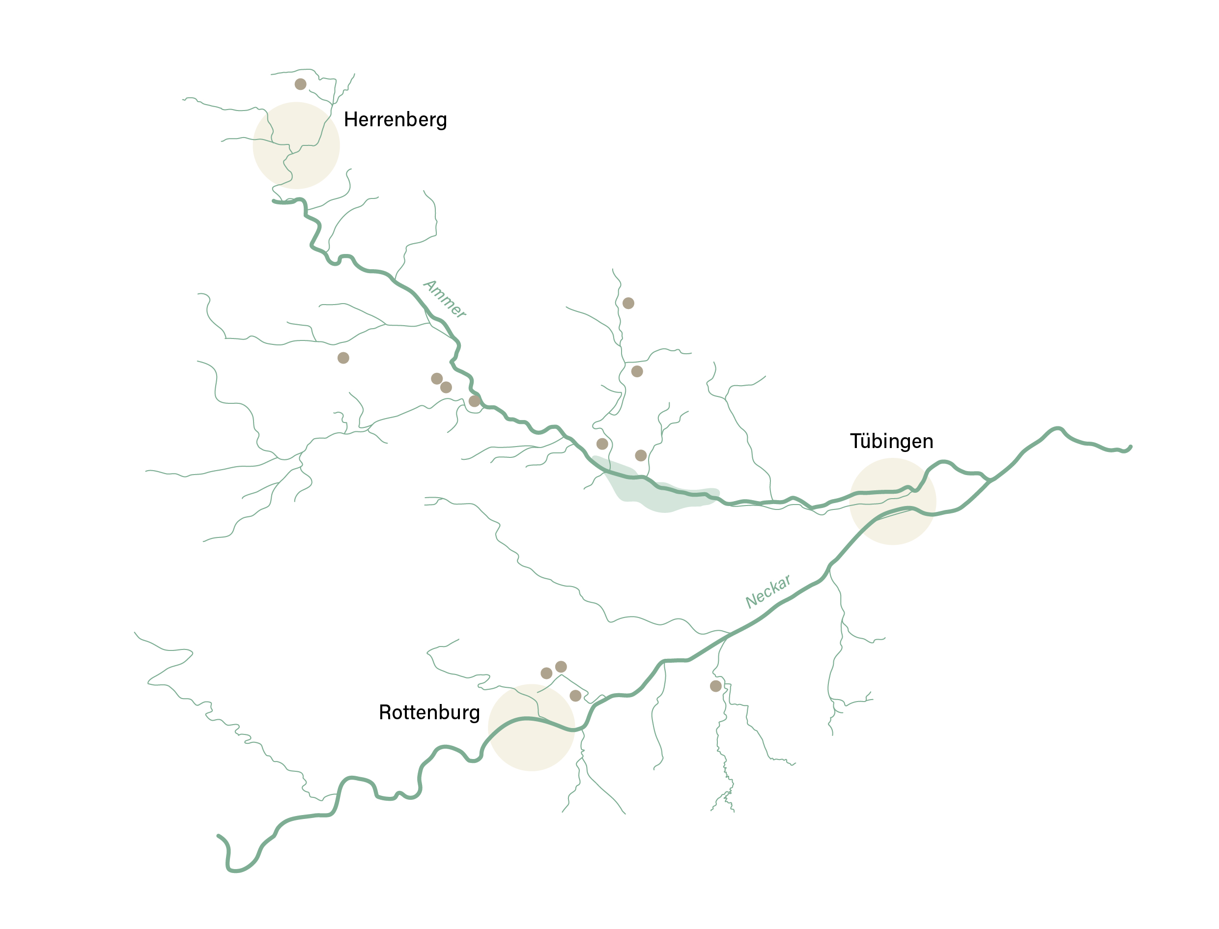 Lage der in der Ausstellung vorgestellten archäologischen Fundplätze im Ammer- und Neckartal, Abbildung: Universität Tübingen/Landesamt für Denkmalpflege Baden-Württemberg (jpg)