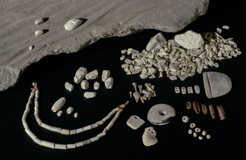 Perlenschmuck aus Hornstaad - Die Werkstücke, Halbfabrikate und Abfälle belegen, dass die Perlen in der Siedlung selbst hergestellt wurden (Quelle: LAD, M. Erne)