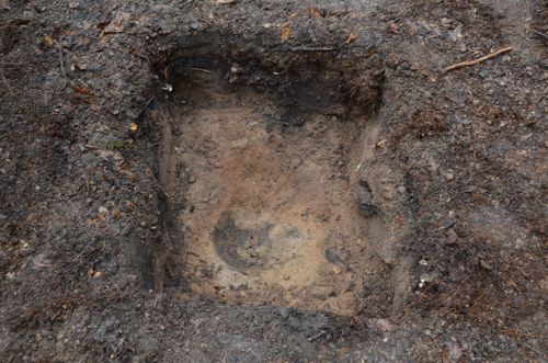 Der unspektakuläre Ausgrabungsbefund der Nachgrabung. In der Mitte zeichnet sich ein dunkler Fleck ab. In dieser kleinen Vertiefung stand ursprünglich der Münzschatz.