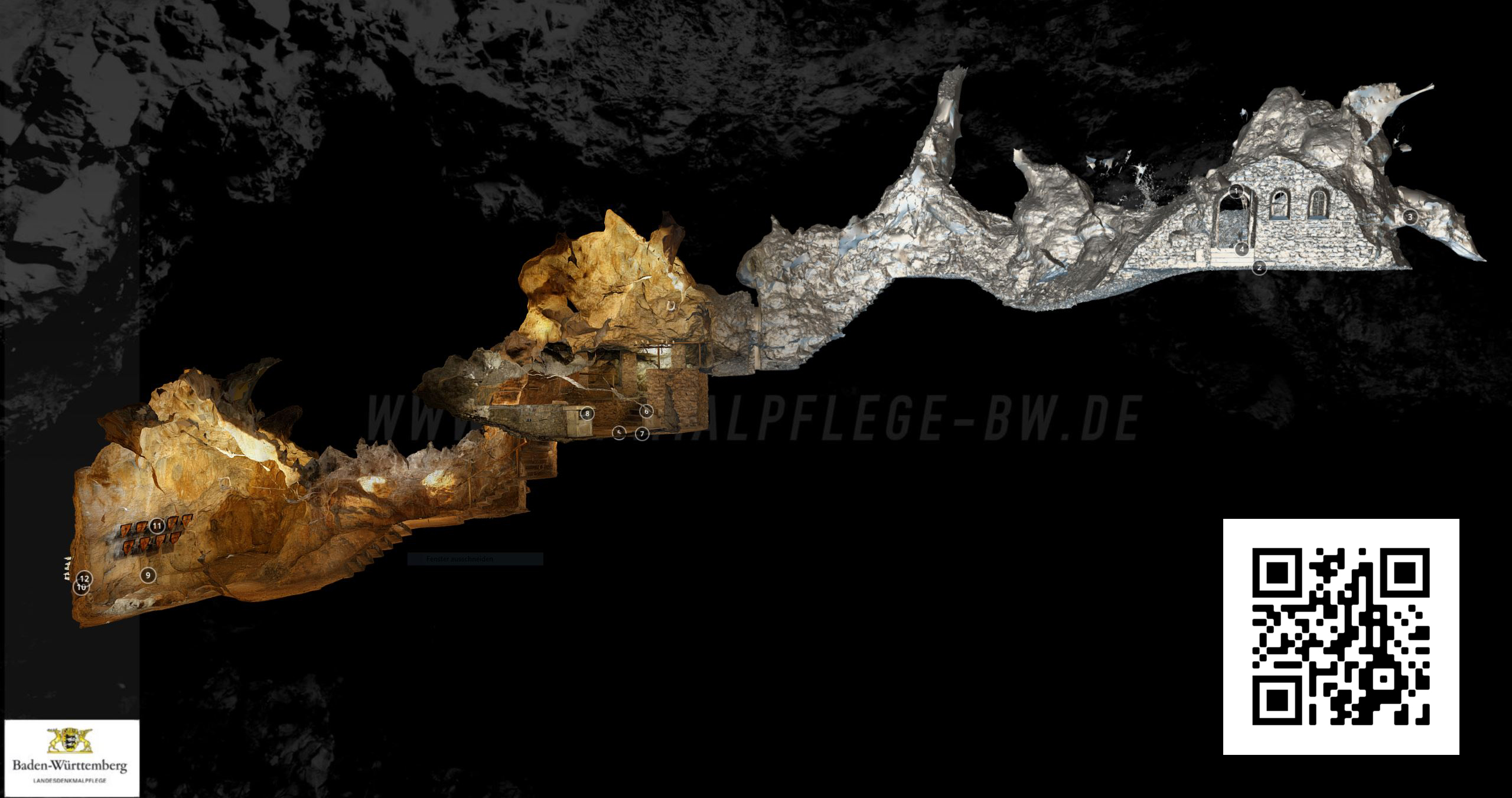 Abbildung 1: 3D-Fotogrammetrische Gesamtaufnahme der Burghöhle Dietfurt aus rund 3.600 Fotos berechnet. Links: mit Fototextur, rechts: nur die Geometrie. Der im QR-Code verschlüsselte Link führt zum 3D-Modell (© Landesamt für Denkmalpflege im Regierungspräsidium Stuttgart/Modell: Christoph Steffen und Markus Steffen). (jpg, 895 KB)