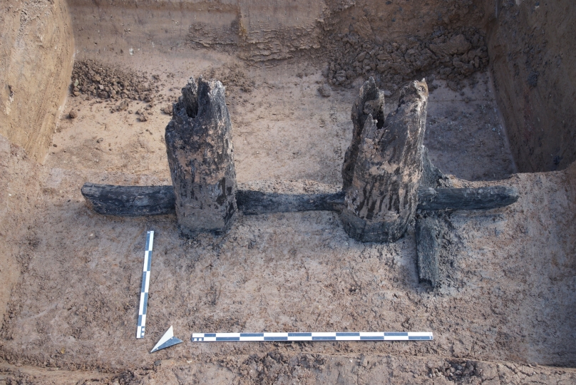 Bild 2: Die beiden erhaltenen Eichenbalken der Baumkelter aus dem 14. Jahrhundert (Quelle: Landesamt für Denkmalpflege im Regierungspräsidium Stuttgart/ Ch. Kutz, Archäologische Ausgrabungen und Bauprojektbetreuung) (jpg, 397 KB)