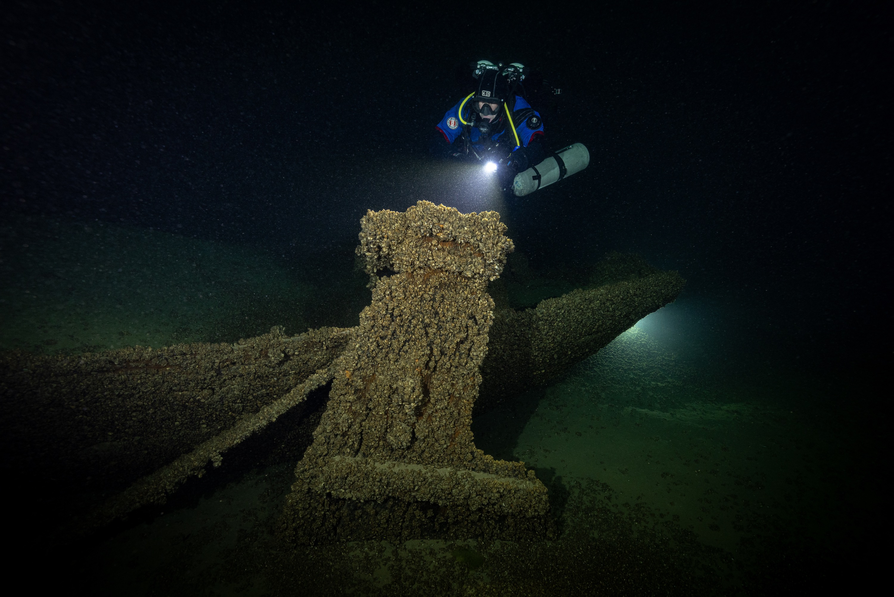 Ein Forschungstaucher inspiziert das Ruder am Heck eines Wracks im Bodensee, Quelle: LAD im RPS, Submaris (jpg, 1.8 MB)