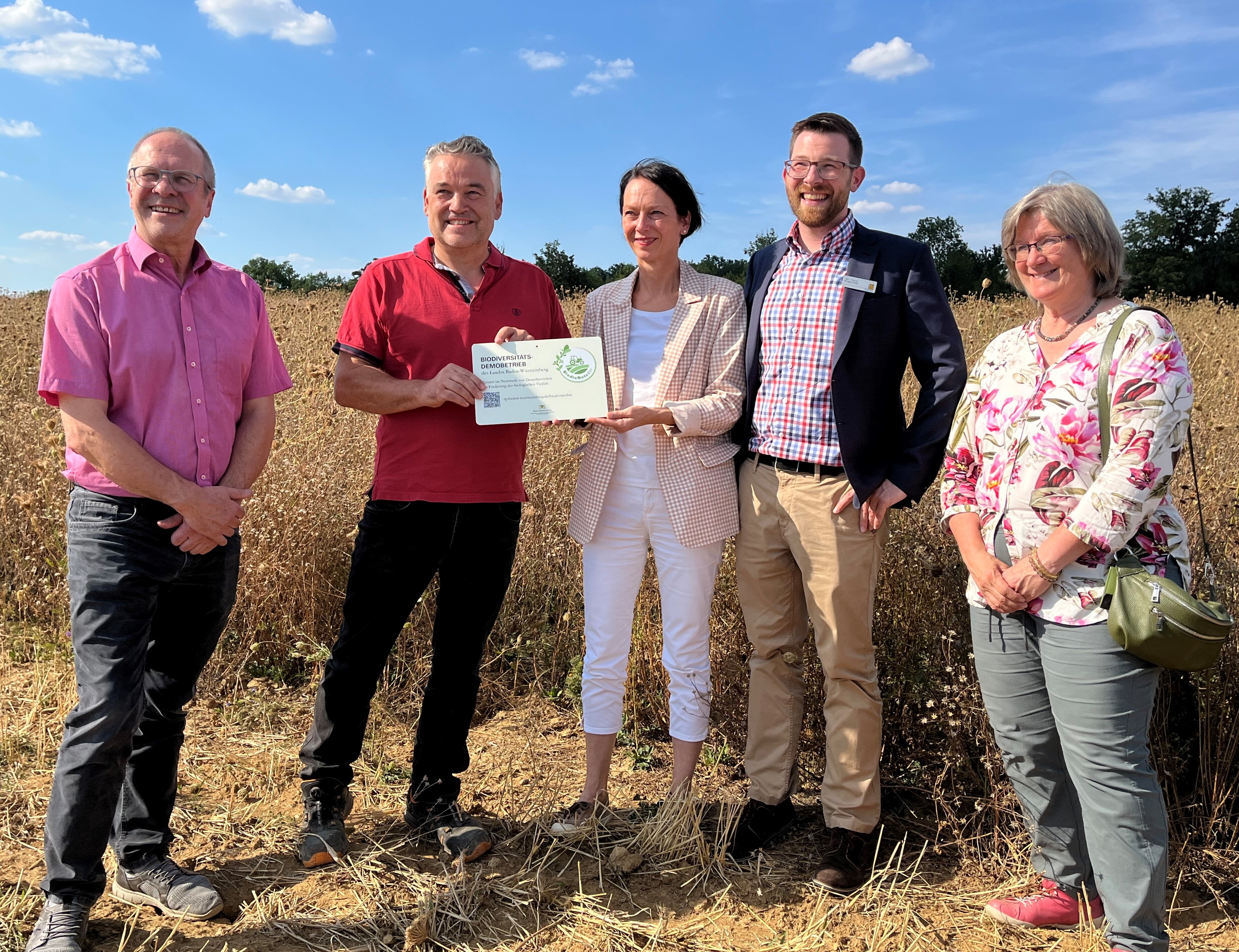 Das „Netzwerk von Demobetrieben zur Förderung der biologischen Vielfalt in Baden-Württemberg“ (BiodivNetz BW) wurde heute (23. August 2022) mit der Übergabe einer BiodivNetz-Hof-Plakette durch Regierungspräsidentin Susanne Bay an Landwirt Werner Zibold auf einer Ackerfläche seines Betriebes in Markgröningen-Unterriexingen im Landkreis Ludwigsburg offiziell für den Regierungsbezirk Stuttgart eröffnet. Zibolds Betrieb ist einer der fünf bisher für das Netzwerk ausgewählten Betriebe im Stuttgarter Regierungsbezirk. Die vier weiteren bisher ausgewählten Betriebe befinden sich in den Landkreisen Böblingen, Schwäbisch Hall, Göppingen und im Rems-Murr-Kreis.