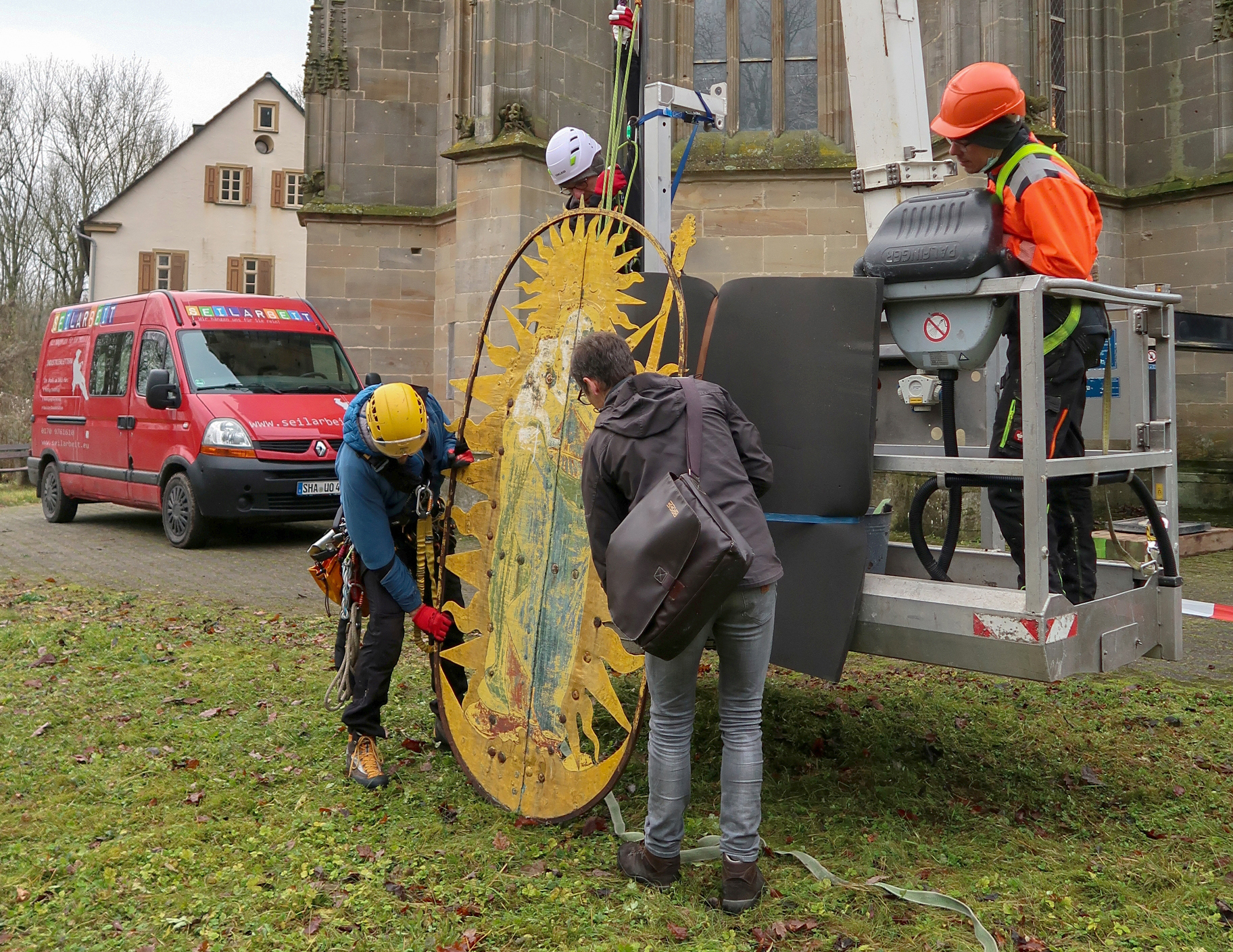 Seit Jahrhunderten fällt der schützende Blick der Madonna von der Turmspitze der Marienwallfahrtskirche über den Ort Laudenbach. Vergangenen Donnerstag (16. Dezember) verließ sie ihren bisherigen Platz, um vorübergehend im Restaurierungsatelier des Landesamts für Denkmalpflege (LAD) im Regierungspräsidium Stuttgart untergebracht zu werden. Dort wird sie in Kooperation mit dem Studiengang für Objektrestaurierung der Akademie der Bildenden Künste in Stuttgart untersucht und restauriert.