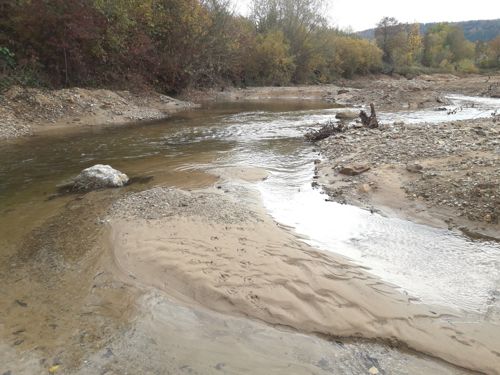 Doch anders auf der linken Seite: hier war mehr Platz, um die steilen Ufer abzuflachen und der Rems wieder mehr Raum zu geben. Immerhin wurden etwa 4000 m3 Kies ausgebaggert und zwischengelagert, der der Rems aber wieder zugeführt werden soll. Geschiebe ist wertvoll für den Fluss und soll daher im Fluss verbleiben oder wieder eingebracht werden. Gerade Kiesflächen bieten optimale Habitatbedingungen für Kleinlebewesen und Fische. Doch Kiesbänke gibt es mittlerweile selten. Oftmals verschlammen die Gewässer aufgrund der geringen Fließgeschwindigkeiten (bedingt z.B. durch Querbauwerke zur Wasserkraftnutzung) und setzen das für die Kleinlebewesen so wichtige Lückensystem im Kieskörper zu. Weitere Ursachen sind Mangel an Geschiebenachschub, fehlende Umlagerungen und eine geringe Gewässerbettdynamik. Doch das soll zumindest im umgestalteten Abschnitt anders werden: hier hat man der Rems wieder mehr Platz gegeben, um den Kies umzulagern und auch mal wieder über die Ufer zu treten. Die vorhandene Gewässerbefestigung aus Draht und Steinen wurde ausgebaut, Ufer abgeflacht und verschiedene Strukturelemente wie Inseln und Buhnen eingebaut.