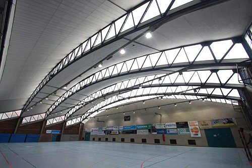 Vor allem das vierteilige Schalendach verleiht dem Hallenbau eine skulpturale Qualität und unterstreicht mit seinem nach oben strebenden, dynamischen Charakter die Funktion des Gebäudes als Sportstätte. Zu einem besonderen Blickfang wird die Halle bei abendlichem Sportbetrieb, wenn die hintereinander gestaffelten Fensterbänder der Sheds von innen beleuchtet weithin sichtbar werden.