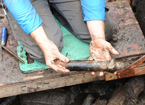 Zu den spannendsten Neufunden der diesjährigen Kampagne gehören ein Achsenfragment von einem Wagen und eine Geweihhacke, beides extrem seltene Objekte. Das Achsenfragment passt zu den bereits vor einigen Jahren in Olzreute Enzisreut gefundenen Rädern und einem ähnlichen Achsenstück [Bild 2]. Die Geweihhacke wurde aus einer Sprosse gefertigt und ist vorne abgebrochen [Bild 1]. Wie auch alle anderen Funde aus organischem Material sind sie dank des feuchten Fundmilieus hervorragend erhalten und geben einen direkten Einblick in das Leben der frühen Bauern am Federsee.
