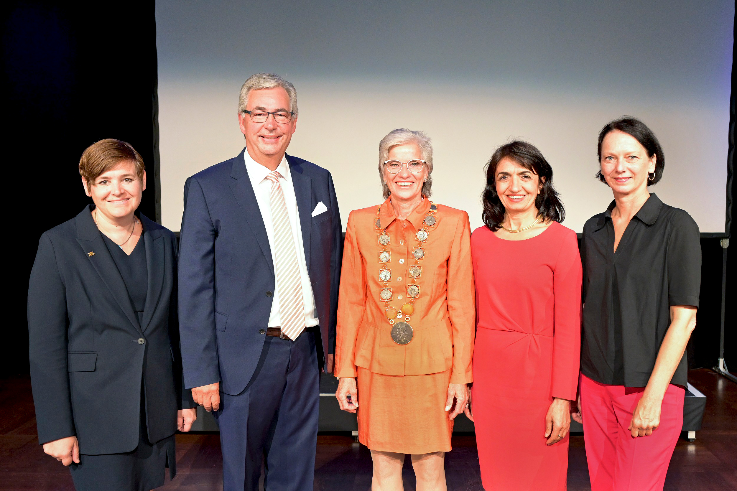 Regierungspräsidentin Susanne Bay (rechts) bedauerte bei ihrer Rede, dass es mit dem Dienstende von Oberbürgermeisterin Ursula Keck (Mitte) nur noch fünf Oberbürgermeisterinnen in Baden-Württemberg geben wird