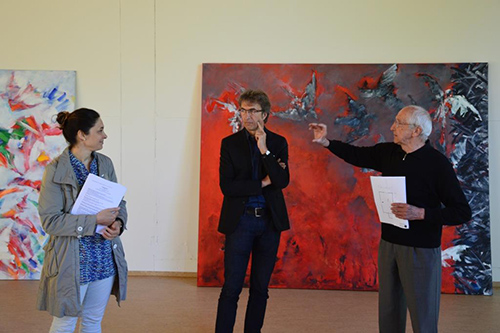 Von links Silke Schwab-Krüger, Lehrerin am Peutinger-Gymnasium Ellwangen, Berthold Weiß, Leiter der LEA Ellwangen und den Künstler Horst Solf (Foto: RPS)
