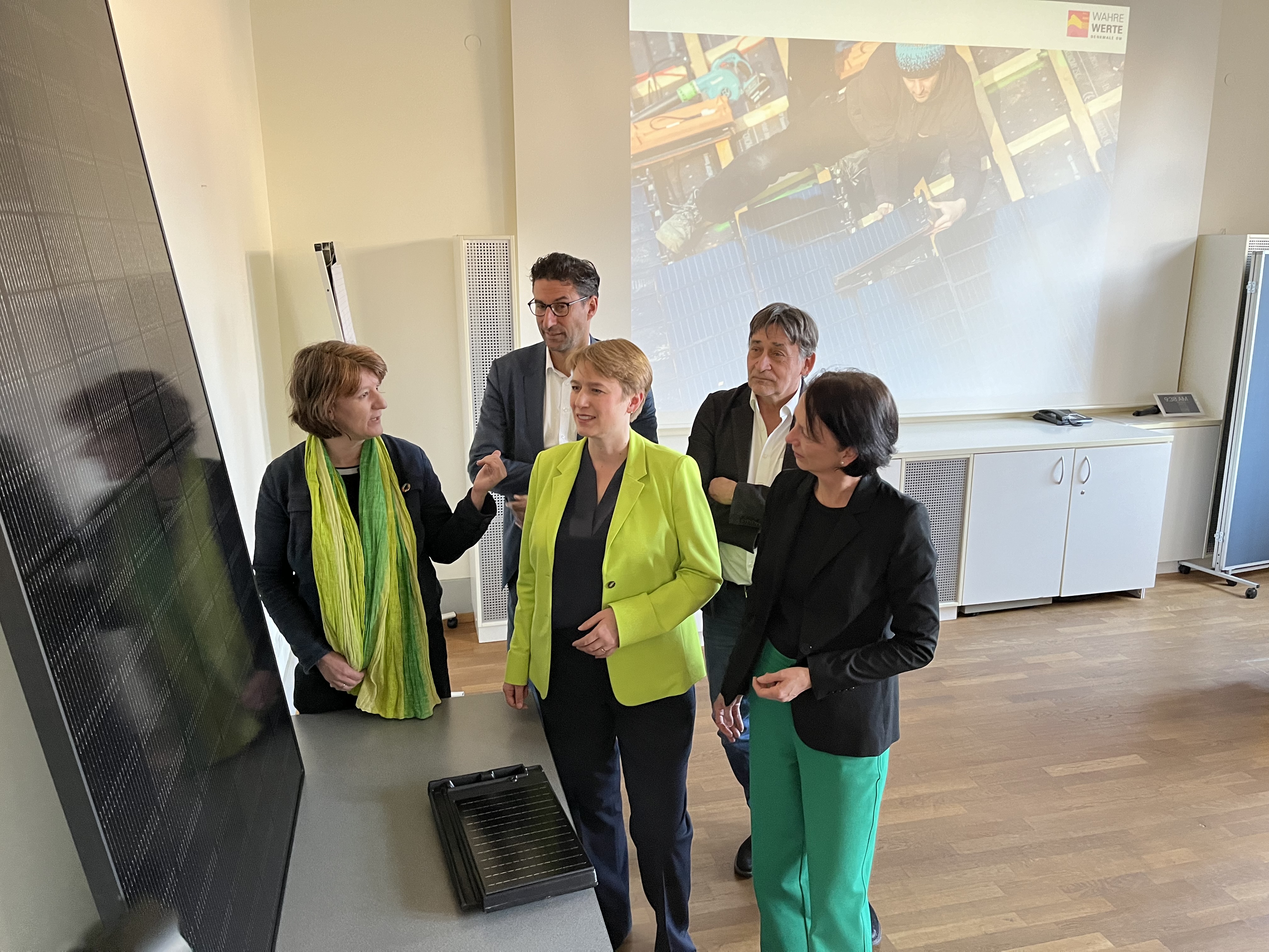 Der Landesbetrieb Vermögen und Bau Baden-Württemberg hat auf den Dächern des ehemaligen Schelztor-Gymnasiums in Esslingen, dem Sitz des Landesamts für Denkmalpflege (LAD) im Regierungspräsidium Stuttgart, eine dreiteilige Photovoltaik-Anlage (PV) installiert. Die musterhafte Ausführung soll aufzeigen, wie Denkmalschutz und Klimaschutz miteinander zu vereinen sind. Am Montag wurde die Anlage von Staatssekretärin Gisela Splett (Ministerium für Finanzen Baden-Württemberg) und Staatssekretärin Andrea Lindlohr MdL (Ministerium für Landesentwicklung und Wohnen Baden-Württemberg) im Rahmen eines Pressetermins besichtigt.
