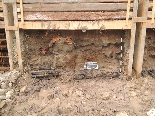 Baugrubenprofil, in dem noch Reste der als Unterbau dienenden Balken und der darauf ruhenden Mauer zu sehen sind.