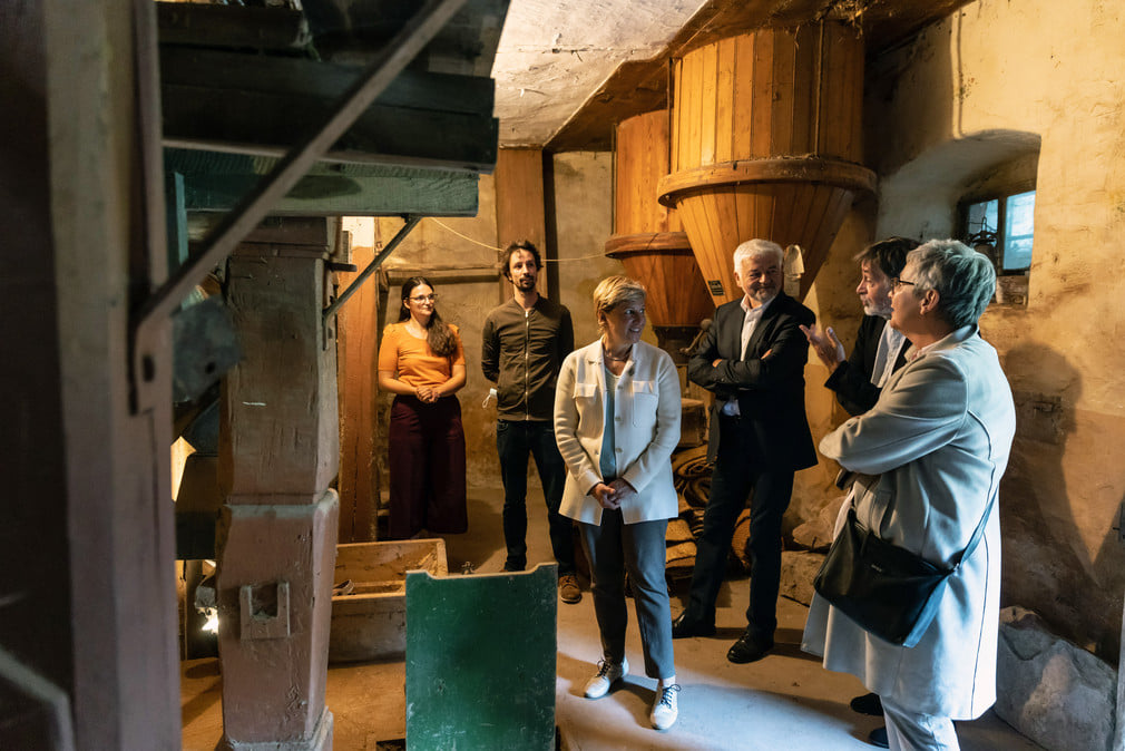 Ihre Tagestour startete Ministerin Razavi bei der sogenannten Oberen Mühle, die letzte von einst drei Mühlen am Amorsbach. Das insgesamt drei Geschosse zählende Hauptgebäude des Mühlenanwesens steht in leichter Hanglage und wurde im Erdgeschoss massiv, in den beiden Obergeschossen als Fachwerkkonstruktion ausgeführt. Eine inschriftliche Datierung am Rundbogentor des Gewölbekellers weist darauf hin, dass das massive Erdgeschoss aus dem späten 16. Jahrhundert stammt. Im Inneren beherbergt das Gebäude neben der Mühlentechnik, eine großzügige Wohneinheit, die mehrere Jahrzehnte in zwei kleine Wohnungen unterteilt war. Prägende Elemente wie Kassettentüren, Dielenböden etc. aus der Nachkriegszeit sind erhalten. Die von den neuen Eigentümern engagiert verfolgte Sanierung berücksichtigt den spezifischen Charakter dieses Kulturdenkmals. Neben der privaten Wohnnutzung wird eine Öffnung des Gebäudes für die Öffentlichkeit als Schaumühle angestrebt. „Wohnen im Denkmal ist gelebte Nachhaltigkeit. Das große Engagement der Eigentümer und der Erhalt des Kulturdenkmals als privater Wohnraum beeindruckt mich“, betont Razavi.