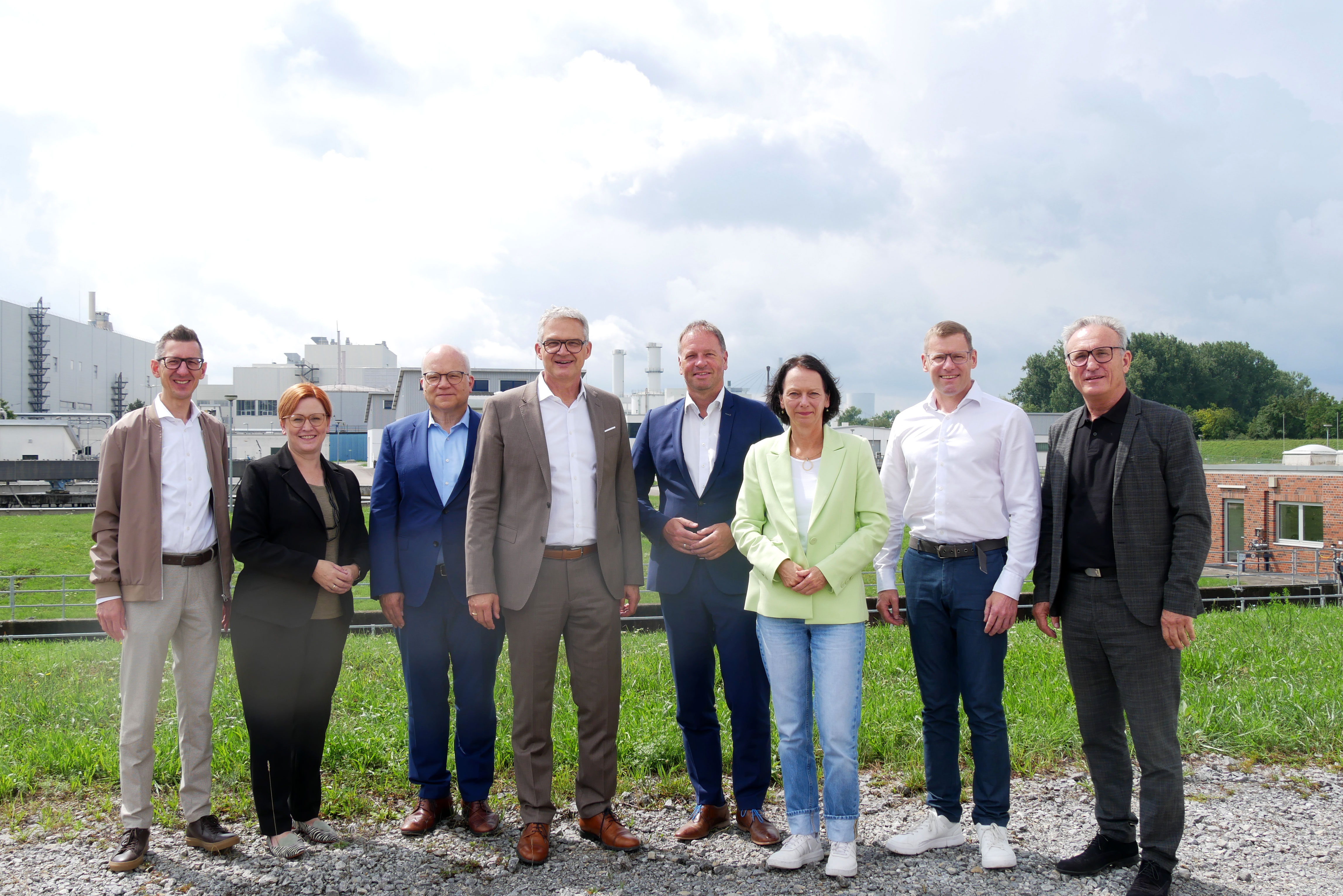 Bild Gruppe (jpg): An der feierlichen Übergabe des Förderbescheids auf dem Gelände der Kläranlage Neckarsulm nahmen weitere Vertreter/innen teil, unter anderem auch die Bürgermeister/die Bürgermeisterin der Verbandskommunen (von links): Patrick Dillig (Eberstadt), Birgit Hannemann (Weinsberg), Landrat Norbert Heuser, Oberbürgermeister Steffen Hertwig, Timo Frey (Bad Friedrichshall), Regierungspräsidentin Susanne Bay, AZV-Geschäftsführer Thorsten Morhaus und Michael Folk (Offenau).
