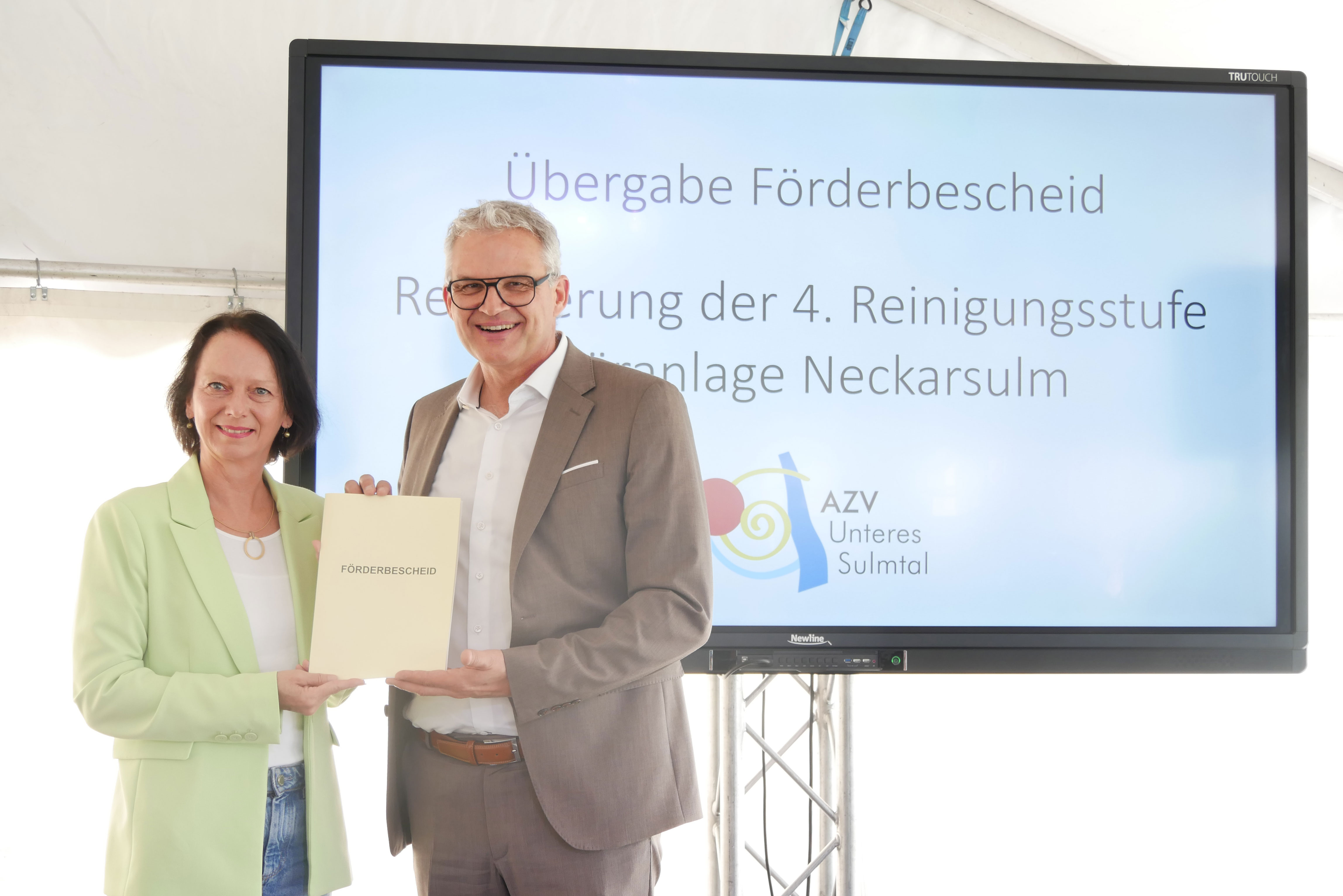 „Die Herausforderungen an unsere kommunale Abwasserreinigung wachsen. Mit diesem Neubau zeigt der Abwasserzweckverband Unteres Sulmtal, wie aktiver Gewässerschutz und technologische Innovation Hand in Hand gehen“, sagte Regierungspräsidentin Susanne Bay bei der Bescheidübergabe an den Vorsitzenden des Abwasserzweckverbands, Neckarsulms Oberbürgermeister Steffen Hertwig, heute (1. August 2025) auf dem Gelände der Kläranlage Neckarsulm. „Ich freue mich sehr, dass wir als Land dieses wegweisende Vorhaben mit einer Förderung von 5.740.400 Millionen unterstützen können.“