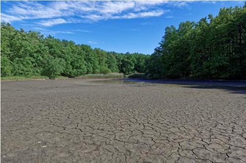 Im Frühjahr abgelassener Reußenbergweiher. Der austrocknende Schlamm am Teichboden bekommt Risse. Foto: Bernd Kunz