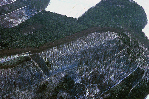 Luftbild der zungenförmig gestalteten Alten Burg bei Langenenslingen. Links sind die gestaffelten Befestigungsanlagen gut erkennbar (Quelle: LAD im RPS)