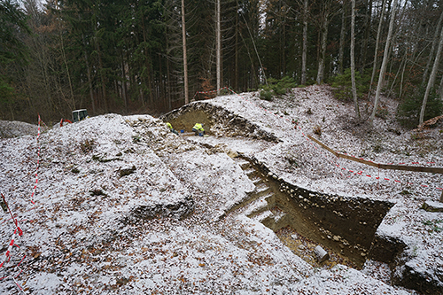 Grabungsschnitt durch die Befestigungsanlage im Osten der Vorburg der Großen Heuneburg bei Zwiefalten-Upflamör mit der Steinmauer, dem dahinter angeschütteten Wall und dem vorgelagerten Graben (Quelle: LAD im RPS)
