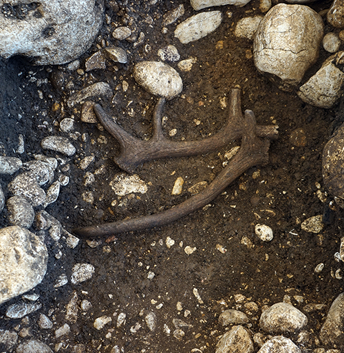 Auf der Sohle einer Grube in Langenenslingen-Emerfeld wurden zwei Hirschgeweihe niedergelegt, was auf rituelle Handlungen hinweist (Quelle: LAD im RPS)